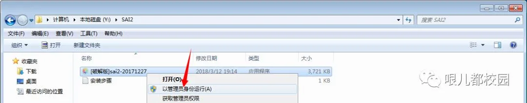 2.打开“SAI2”文件夹,鼠标右击“[破解版]sai2-20171227”,选择“以管理员身份运行”