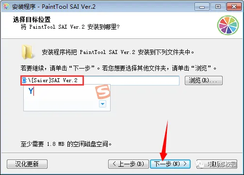 7.选择安装目录,默认安装在 C:\[Saier]SAI Ver.2(建议安装在除C盘以外的磁盘上,可以直接将C改成Y,安装到Y盘),然后点击“下一步”