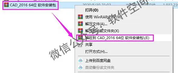 1、首先选中我们从网盘下载后的CAD2016软件安装包,鼠标右击,选择解压。