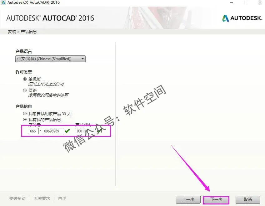 6、输入序列号【666-69696969】,产品密钥【001H1】,点击【下一步】