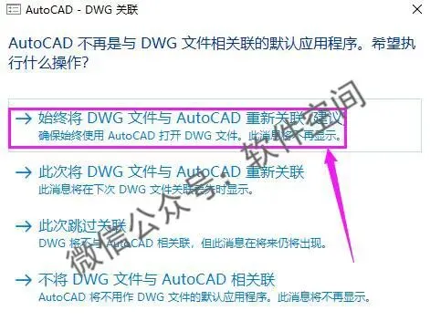 11、点击【始终将DWG文件与AutoCAD重新关联】