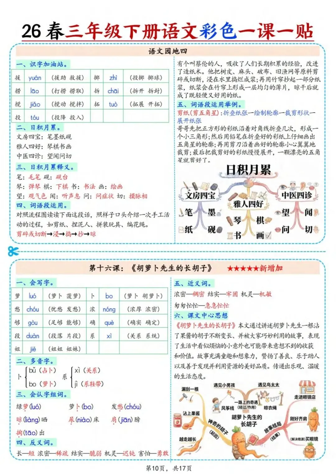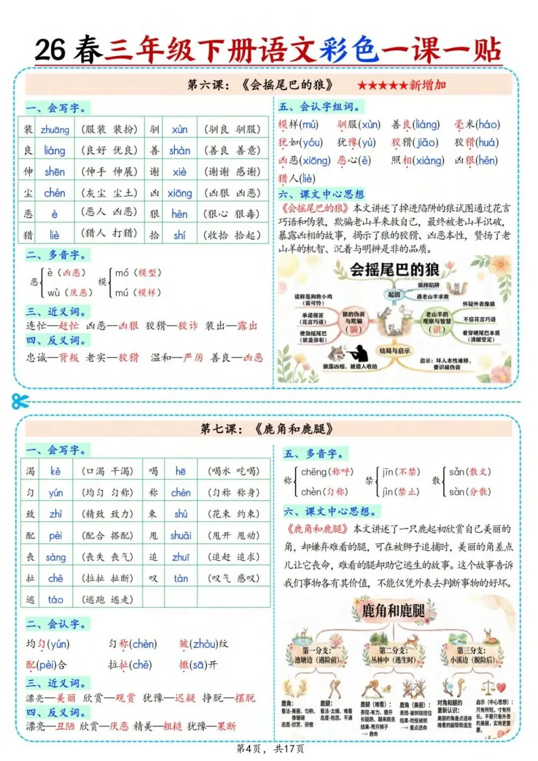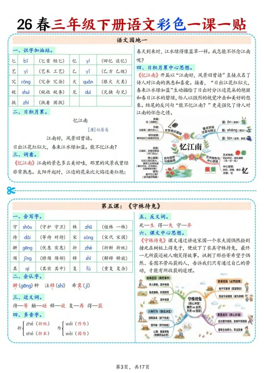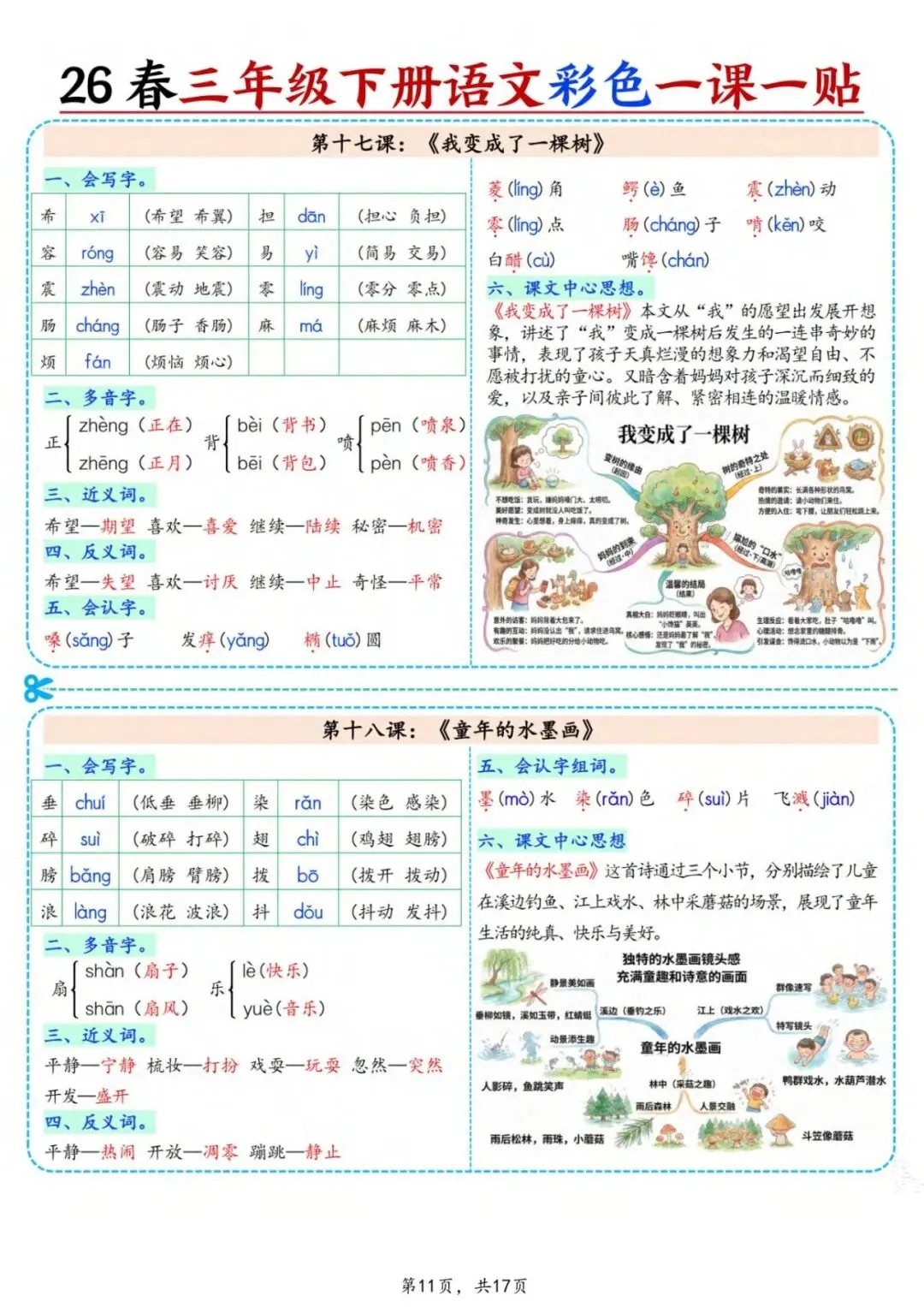 新版三年级下册语文彩色一课一贴,可裁剪,共17页,涵盖了拼音、组词、诗意、课文中心思想等重要考点,需要的家长抓紧打印出来,给孩子练一练吧!