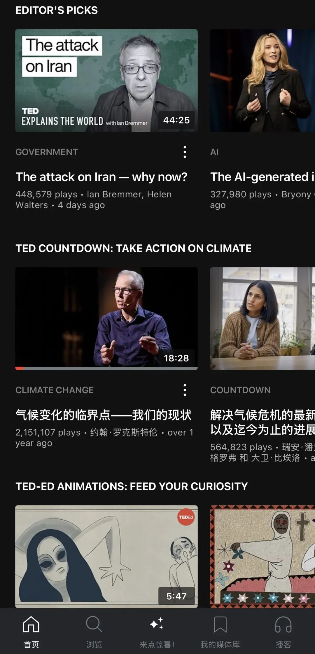为了融入碎片化潮流,应用上线了“TED Shorts”功能。这不仅是把长视频简单切短,而是一种全新的内容形态。点击导航栏按钮,你将进入竖版短视频信息流,观看完整演讲的高光时刻或精彩片段。