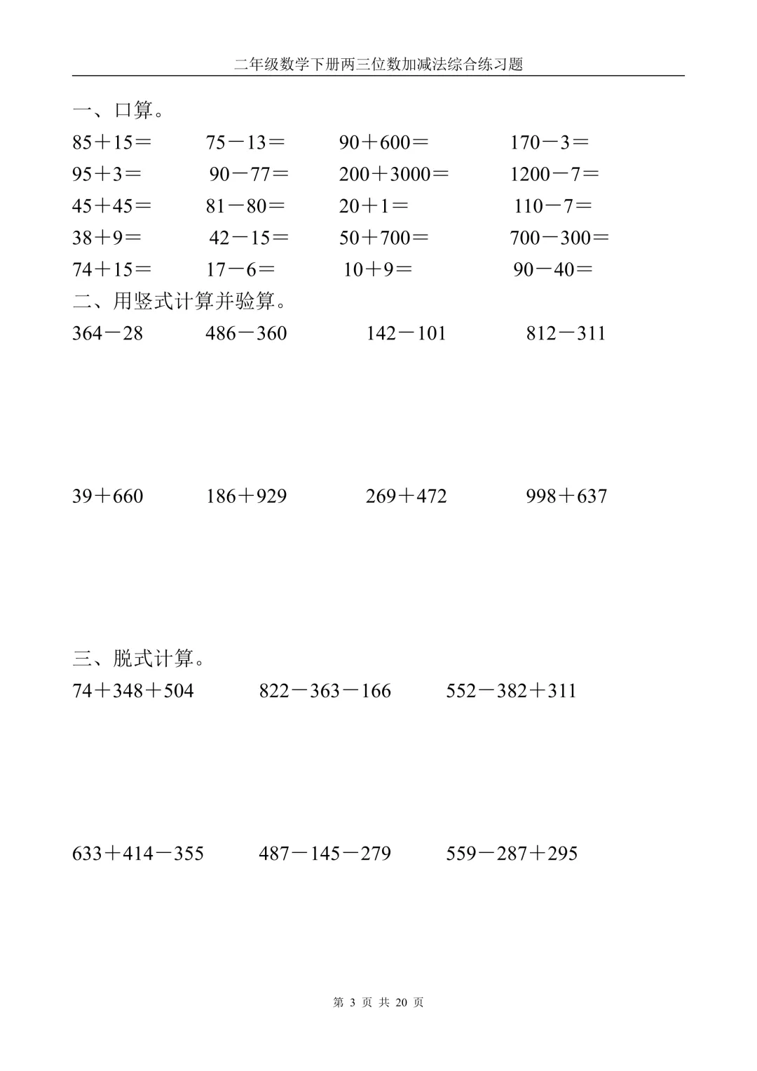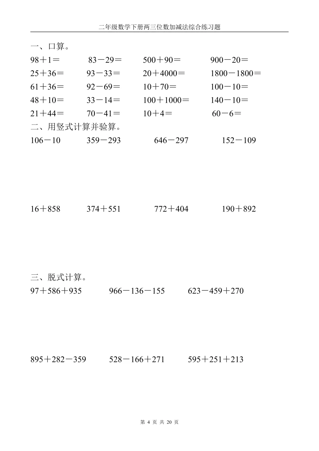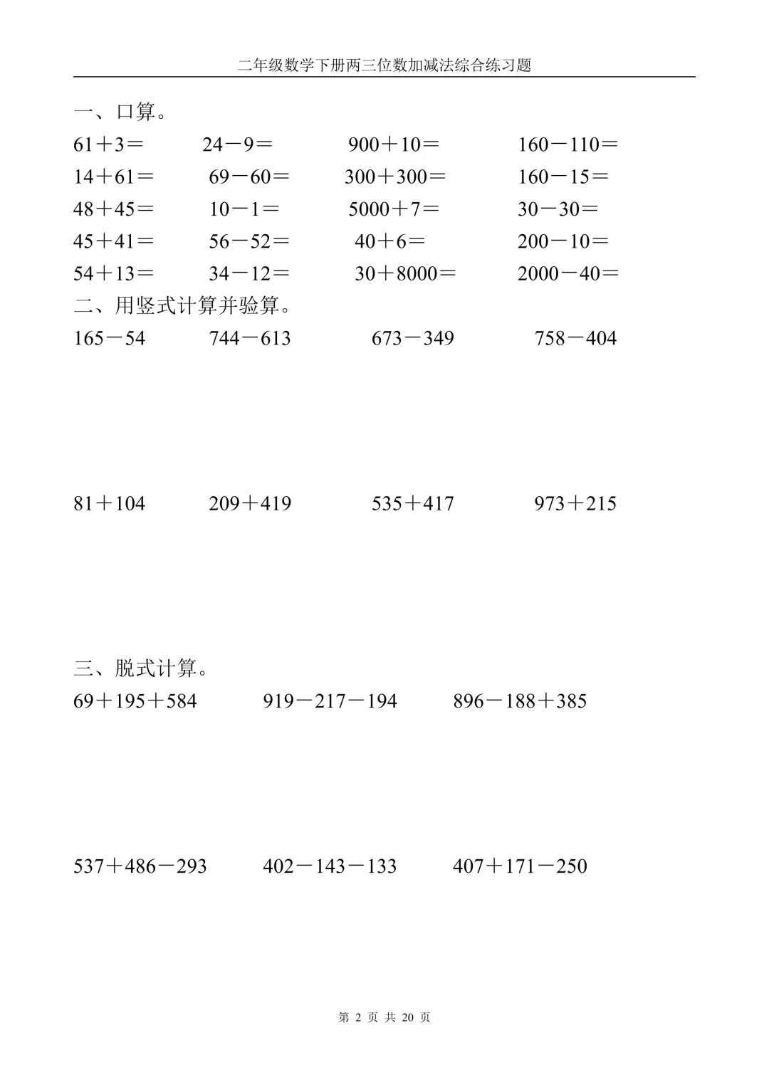 二年级下册数学两三位数加减法计算题(电子版可打印)