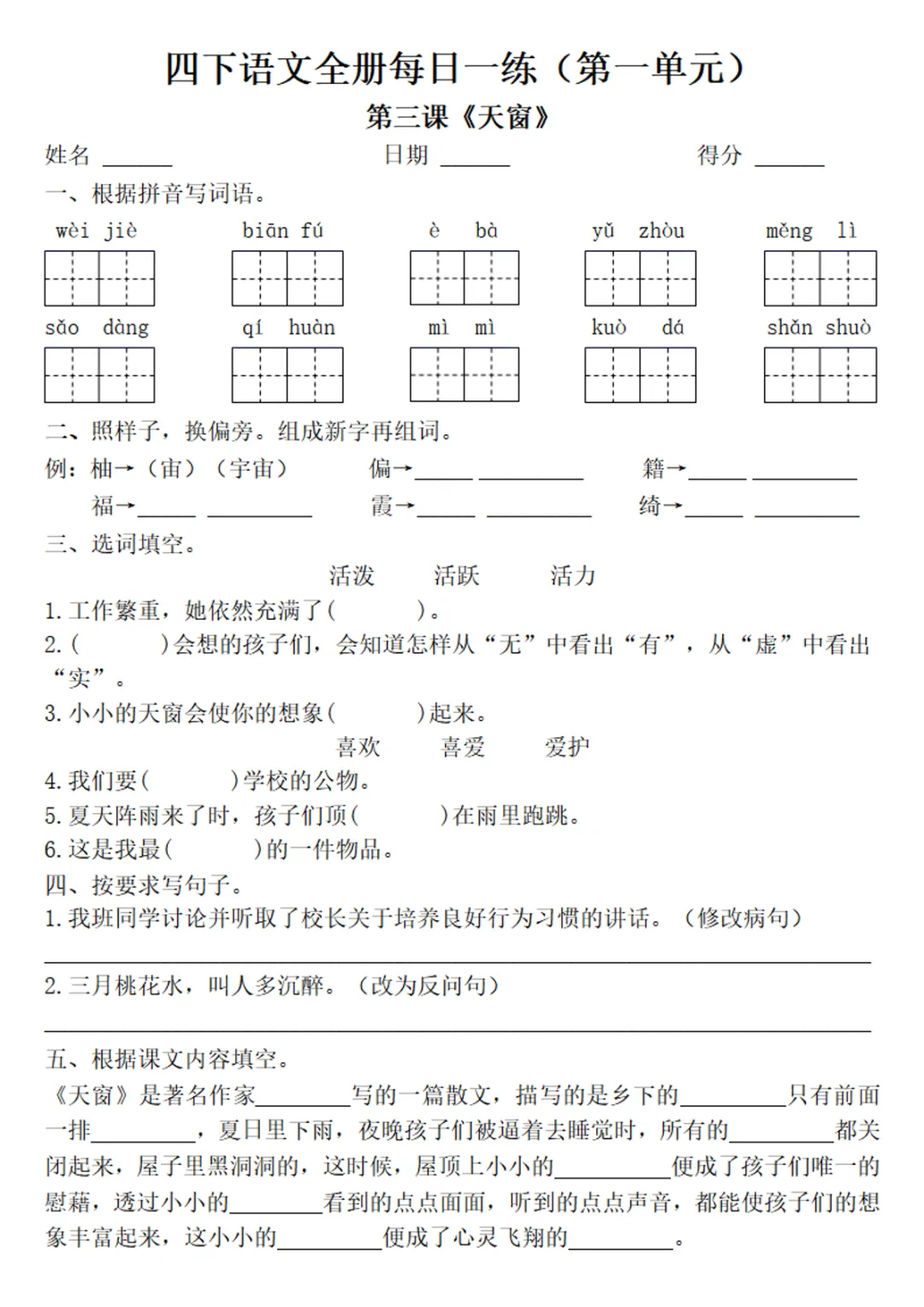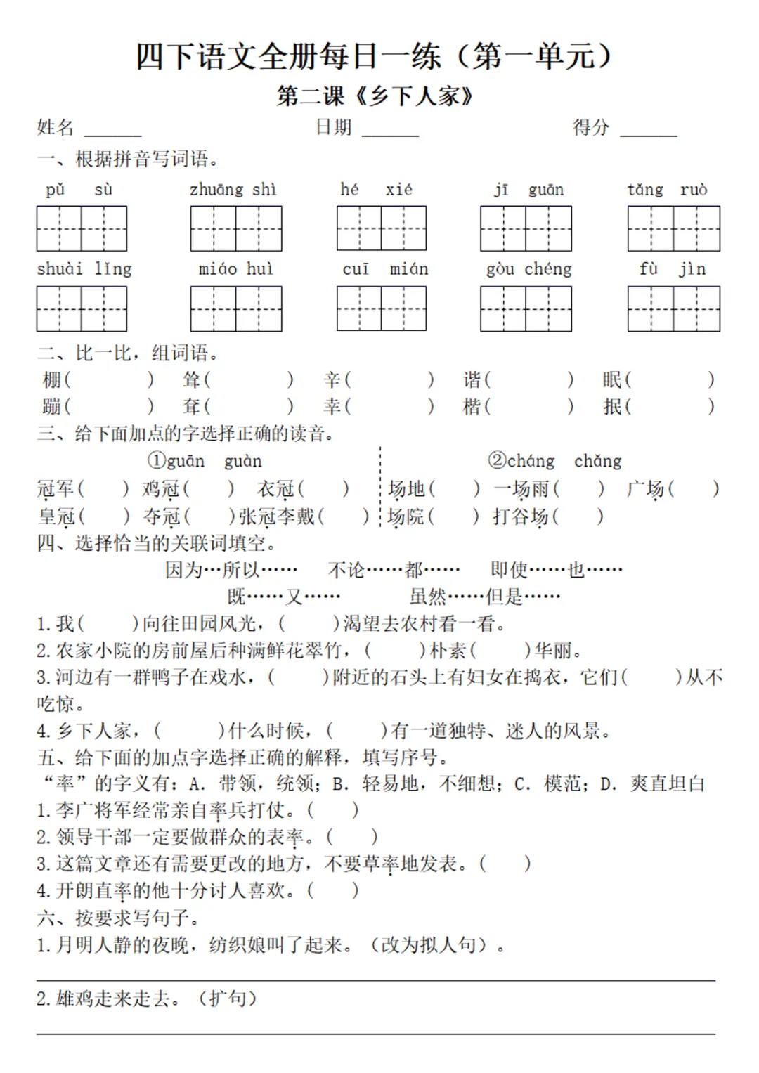 【高清电子版】四年级下册语文全册一课一练(附答案62页)