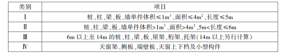 二、预制混凝土构件运输,按下表预制混凝土构件分类。分类表中Ⅰ、Ⅱ类构件的单体体积、面积、长度三个指标中,以符合其中一项指标为准(按就高不就低的原则执行)。