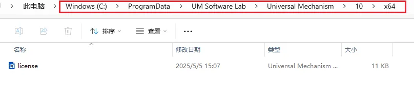 UM软件许可文件固定路径位于:C:\ProgramData\UM Software Lab\Universal Mechanism\10\x64,如下图。