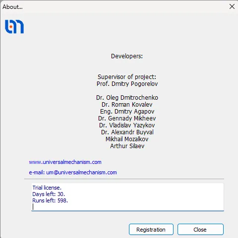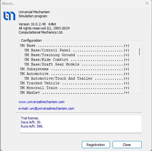 选择UM Simulation仿真程序的菜单Help–About,可查看已授权的模块、许可剩余次数和时间。About界面如下图所示。