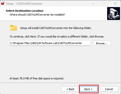 4、UM软件主程序安装路径缺省位于C盘,如需修改,可直接输入或点击Browse自定义路径,然后点击Next。