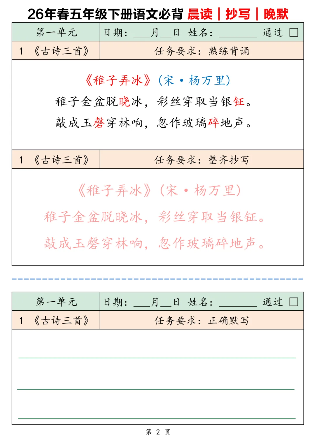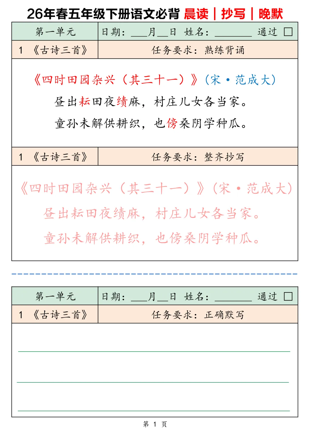 2026春五下语文背诵默写卡片共16页-电子版可下载打印