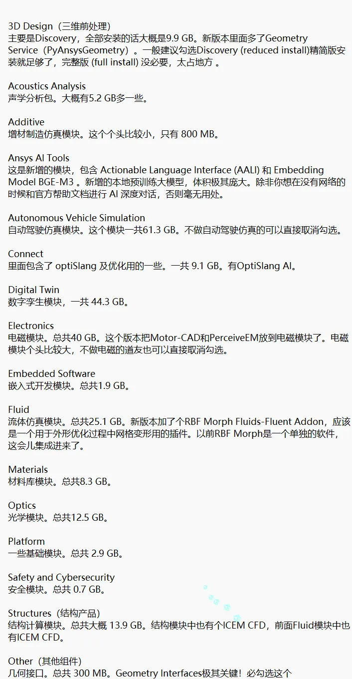 ANSYS 2026 R1安装模块详细说明: