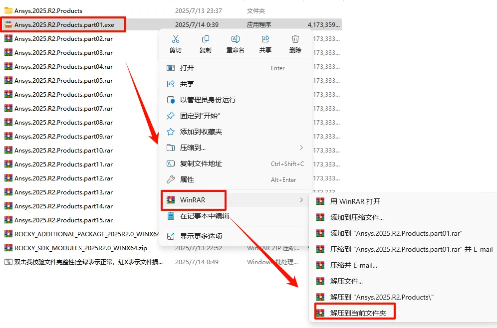 23.返回之前解压的“Ansys.2026.R1.Products”文件夹,选中“ANSYS2026R1_WINX64_DISK1”iso文件,鼠标右键选择“装载”(如果没有“装载”选项的可以右键选择“打开方式—Windows资源管理器”打开)