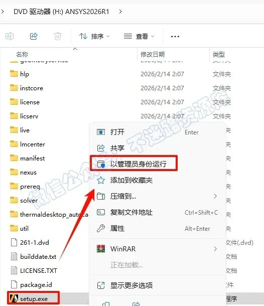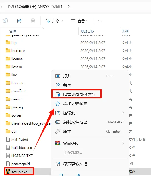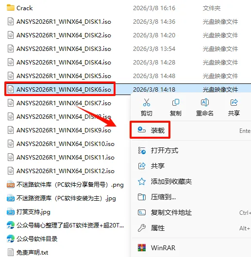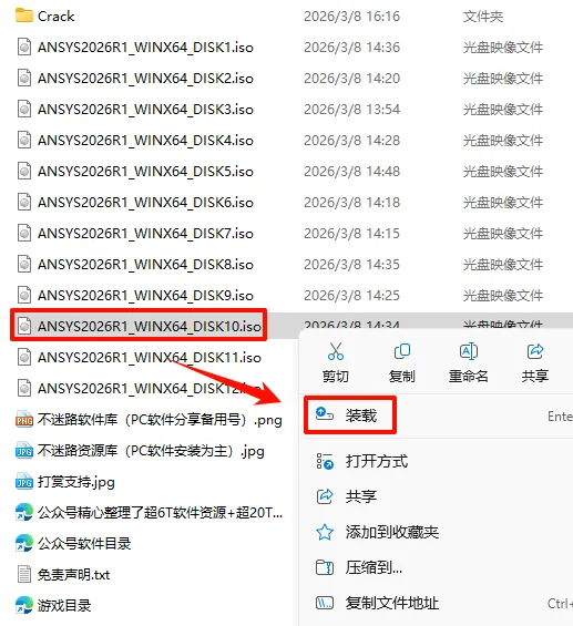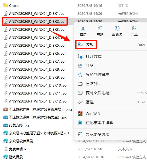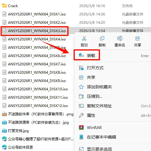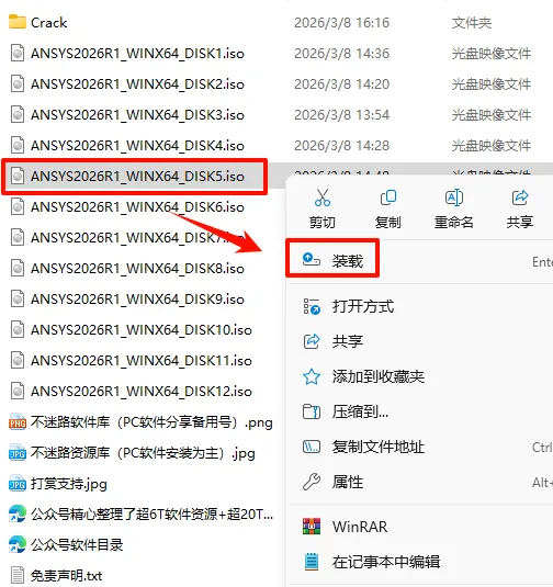 2.打开刚刚解压的文件夹,选中“ANSYS2026R1_WINX64_DISK1”iso文件,鼠标右键选择“装载”(如果没有“装载”选项的可以右键选择“打开方式—Windows资源管理器”打开)