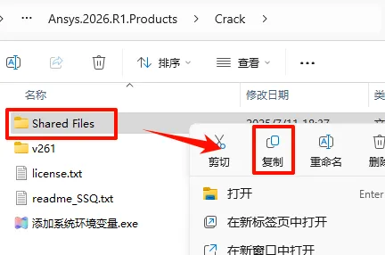 12.返回之前解压的“Ansys.2026.R1.Products”文件夹,双击打开“Crack”文件夹,选中“Shared Files”文件,鼠标右键选择“复制”