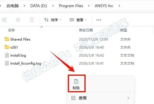 13.依次打开ANSYS License Manager安装路径:D:\Program Files\ANSYS Inc(参看第6步),在打开的文件夹空白处,鼠标右键“粘贴”刚才复制的文件