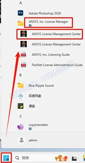 15.点击“开始“菜单栏,找到证书管理中心“ANSYS License Manager Center“,点击打开