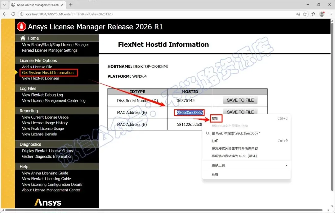 16.打开之后,点击“Get System Hostid Information”,复制第二项的HOSTID(MAC Address)
