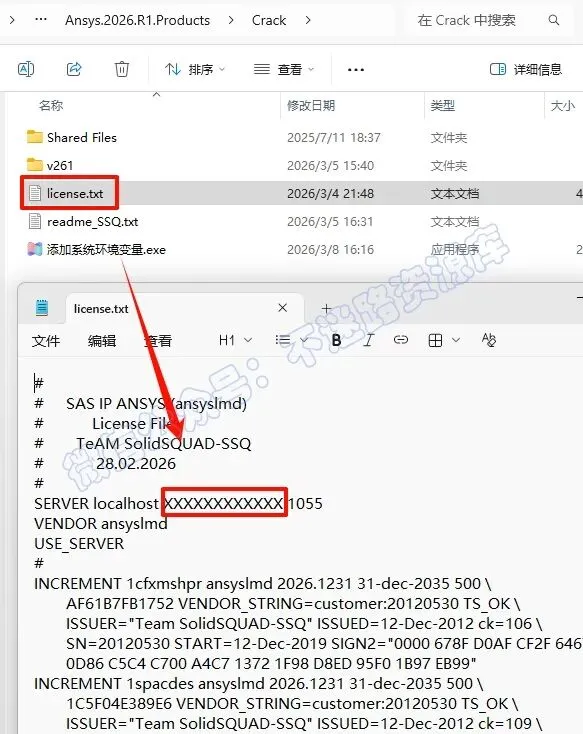 17.返回之前解压的“Ansys.2026.R1.Products”文件夹,双击打开“Crack”文件夹,打开“license.txt”文本文件,在文本中找到“XXXXXXXXXXXX”