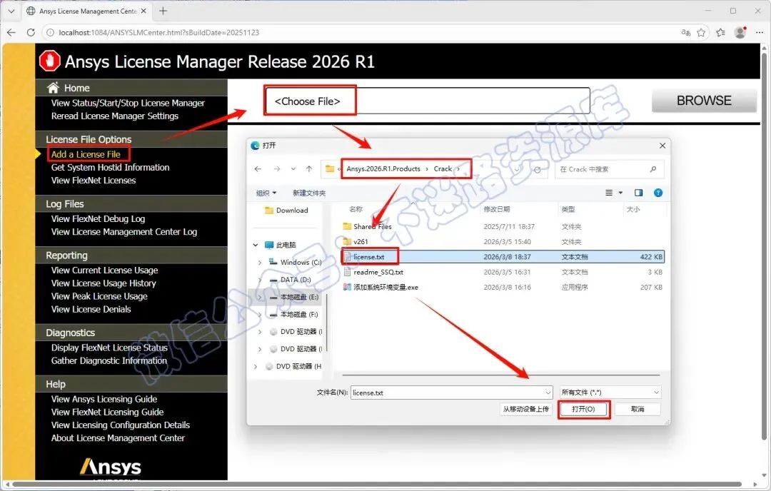 20.返回证书管理中心“ANSYS License Manager Center“界面,点击”Add a License File” ,点击”Choose File” ,浏览选择上一步保存后的”license.txt” 文件(即“Ansys.2026.R1.Products—Crack”文件夹里面),点击 “打开”