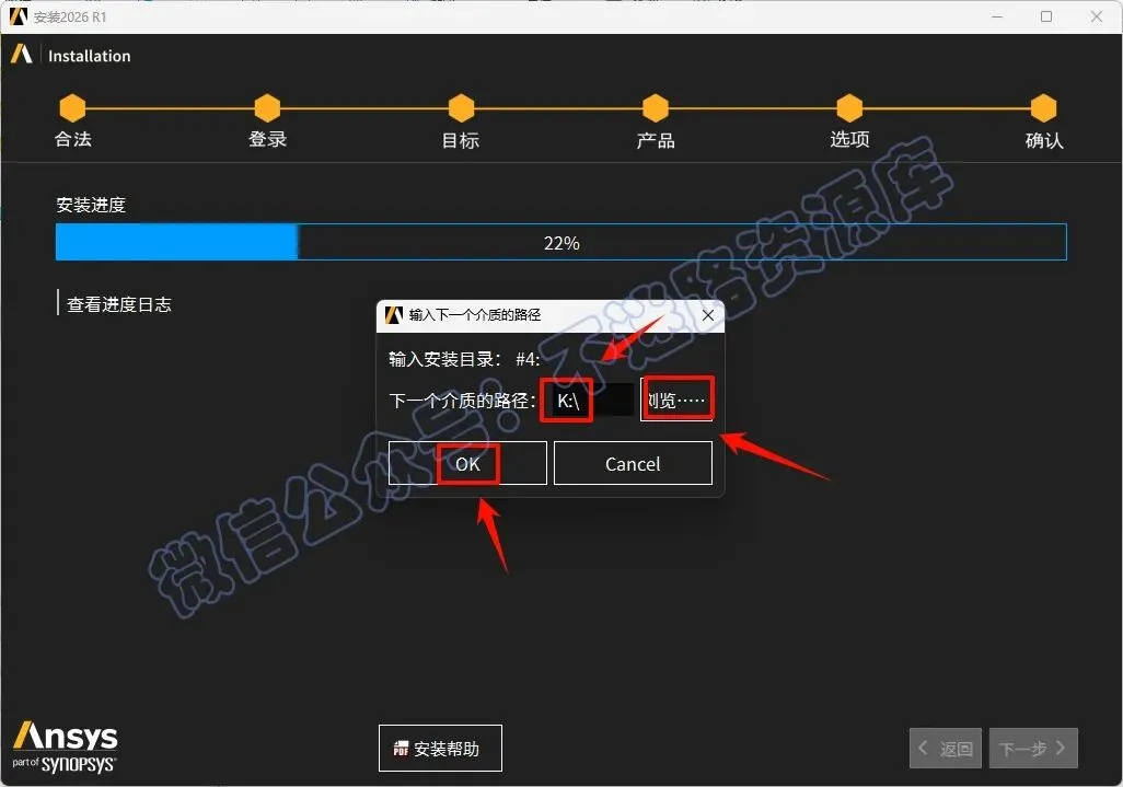 44.中途安装进度达到22%的时候会提示选择下一个介质的路径,返回之前解压的“Ansys.2026.R1.Products”文件夹,选中“ANSYS2026R1_WINX64_DISK4”iso文件,鼠标右键选择“装载”