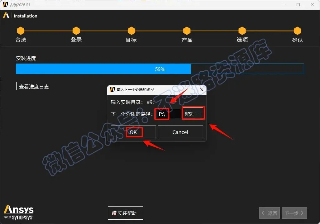 59.中途安装进度达到59%的时候会提示选择下一个介质的路径,返回之前解压的“Ansys.2026.R1.Products”文件夹,选中“ANSYS2026R1_WINX64_DISK9”iso文件,鼠标右键选择“装载”