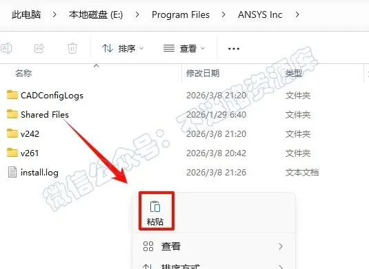 75.依次打开ANSYS安装路径:E:\Program Files\ANSYS Inc(参看第27步),在打开的文件夹空白处,鼠标右键“粘贴”刚才复制的文件