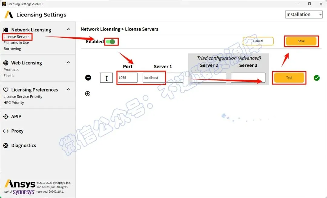 79.选择“Lisence servers”,点击“Enabled“旁边的打开按扭,在“Port”下面的框里输入:1055,在“Server1”下面的框里输入:localhost,点击“Test”,旁边出现绿色的勾,点击”Save“保存
