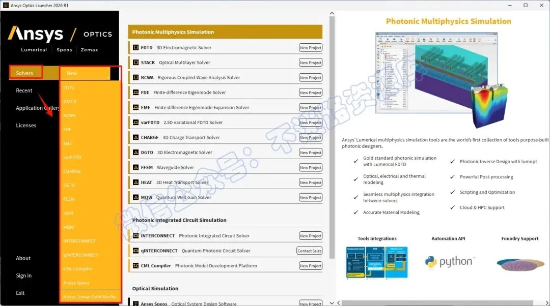 84.点击“Solvers“,点击“New“选择需要软件,Zemax和Lumerical都有