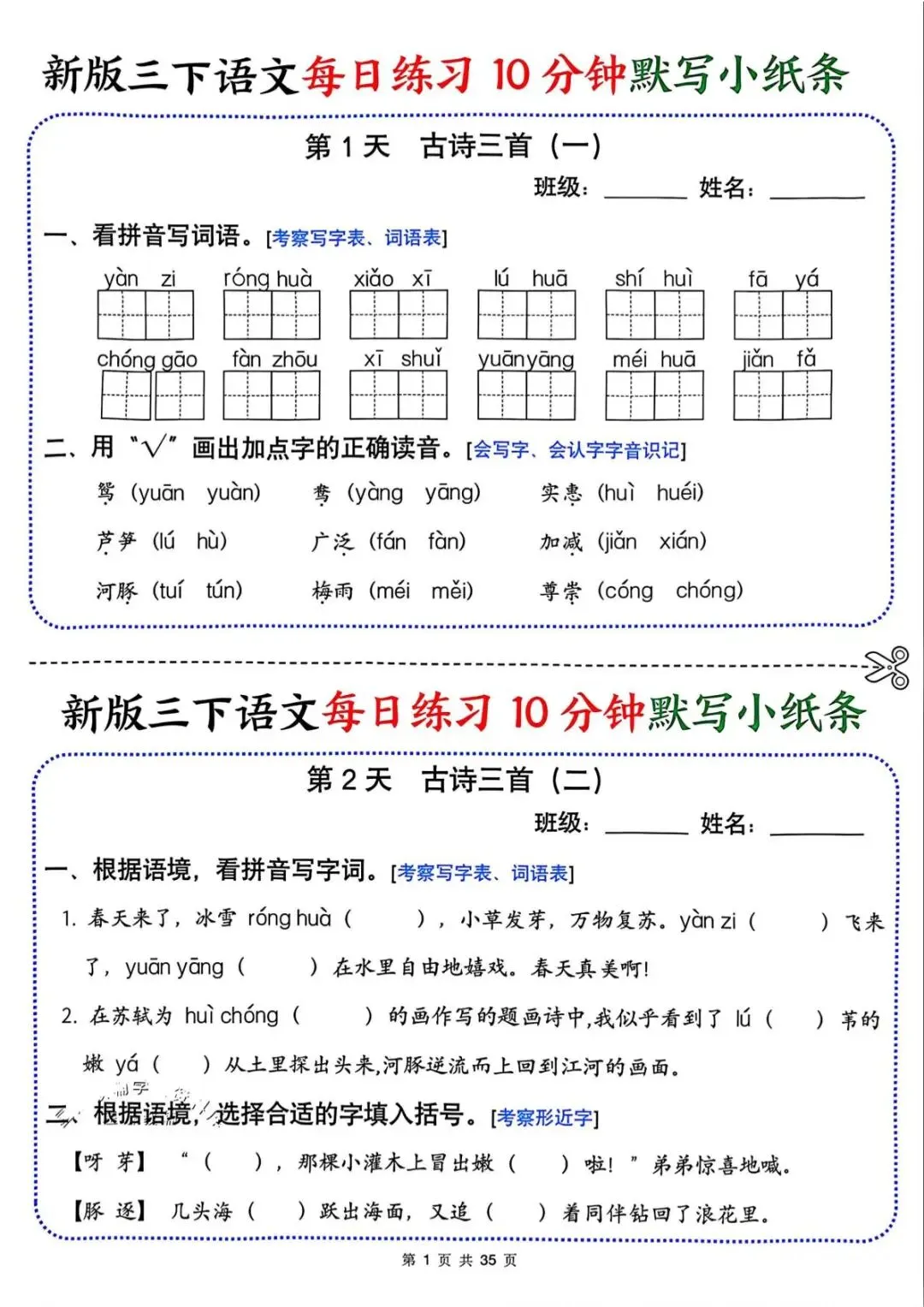 26春人教部编版三年级下册语文《每日练习10分钟默写小纸条》,共70页,含答案,可打印