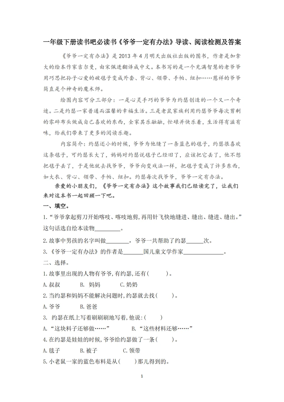 本期分享的是26年一年级语文下册《快乐读书吧导读》可下载打印,需要的家长赶紧打印给孩子练一练,巩固知识。