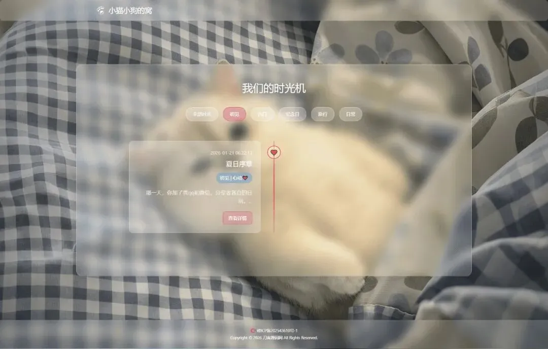「小猫小狗的窝」是一款面向情侣群体的轻量级博客系统,旨在为恋人们提供一个私密、温馨且功能完备的情感记录空间。项目采用前后端分离架构,支持日记撰写、相册管理、时光胶囊、音乐分享、双向留言及共同计划等核心功能,让每一对情侣都能拥有属于自己的线上小窝。