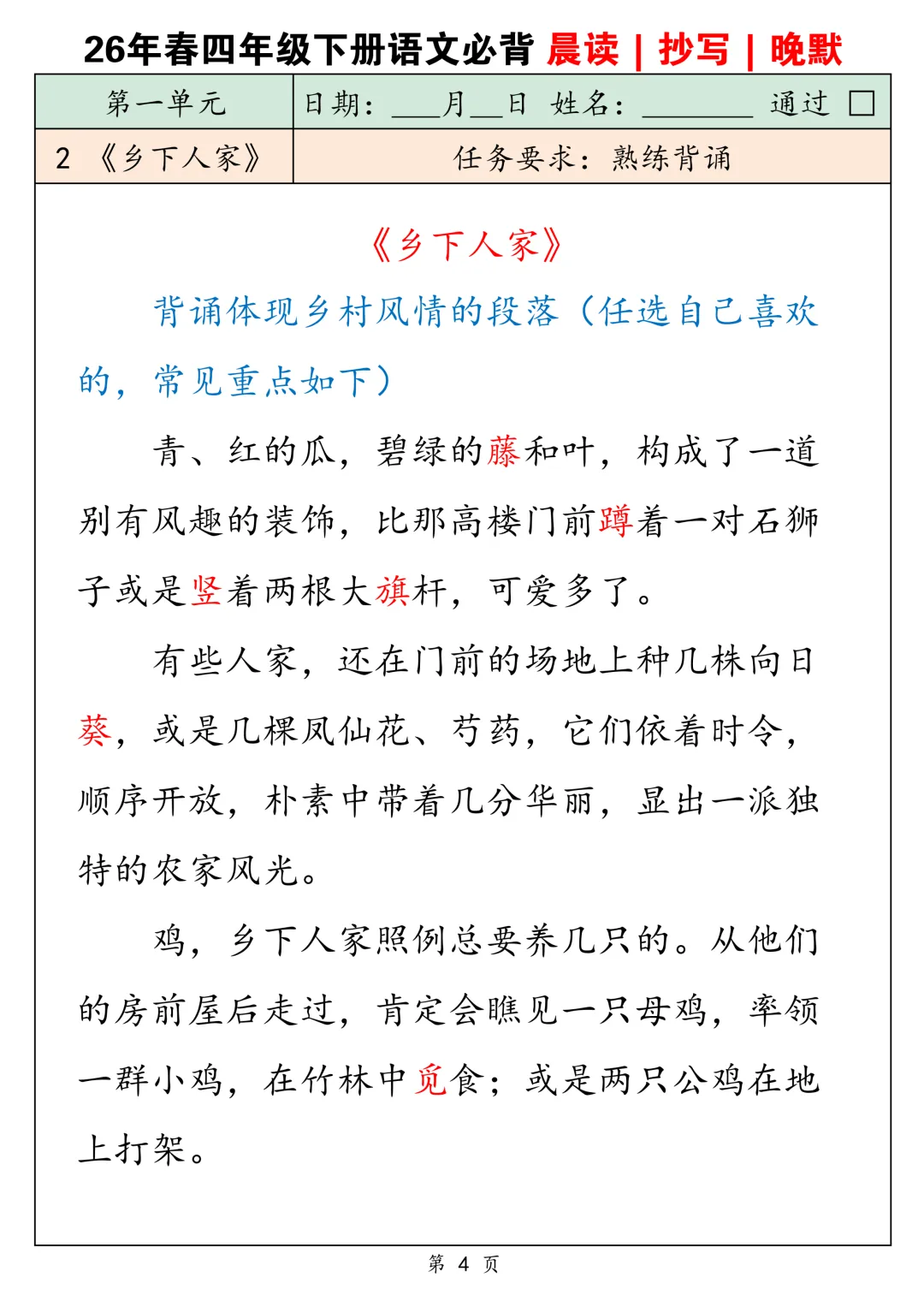 2026春四下语文背诵默写卡片共30页-电子版可下载打印
