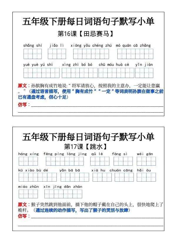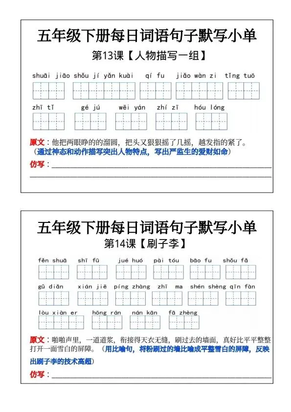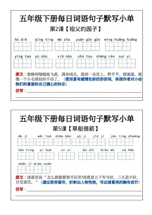 五年级下册语文每日词语句子默写小单(完整电子版可打印)