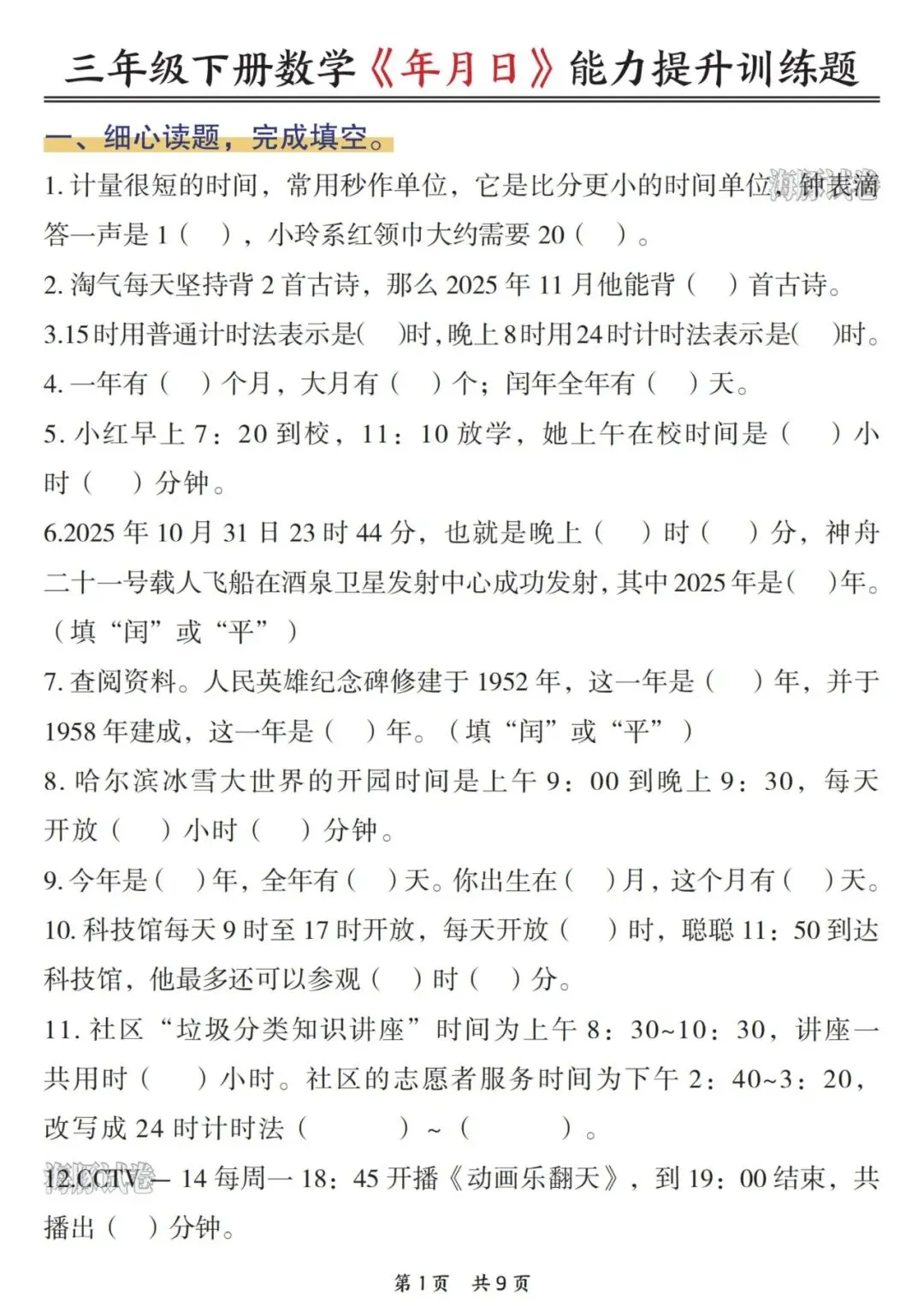 26年春三年级下册数学《年月日专项训练》电子版可打印,这份26年春三年级下册数学年月日专项训练,包含了年月日的填空题,选择题,连线题,思维练习,可以提前巩固所学的重要考点,需要的家长打印下来每天给孩子练习一下吧。