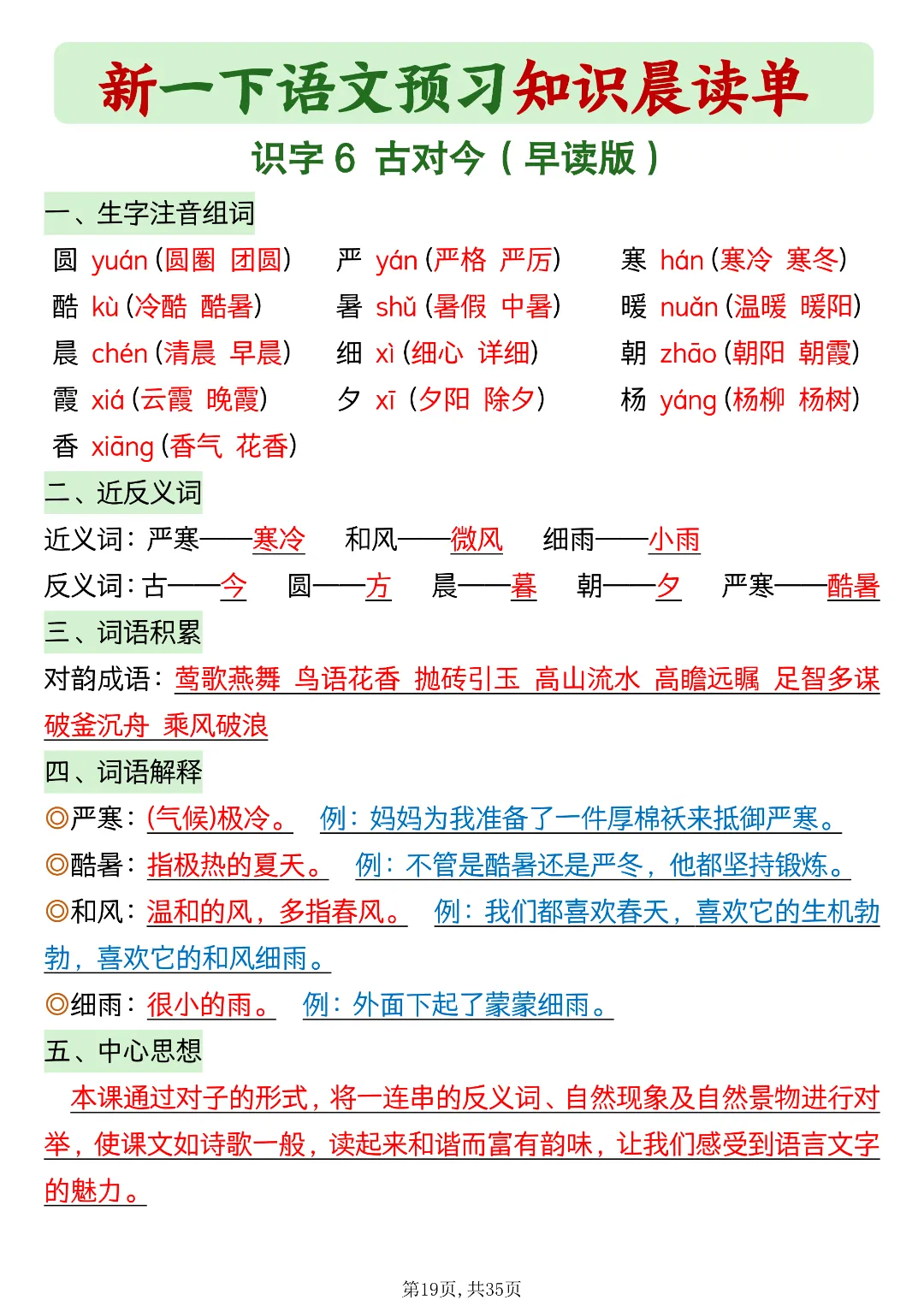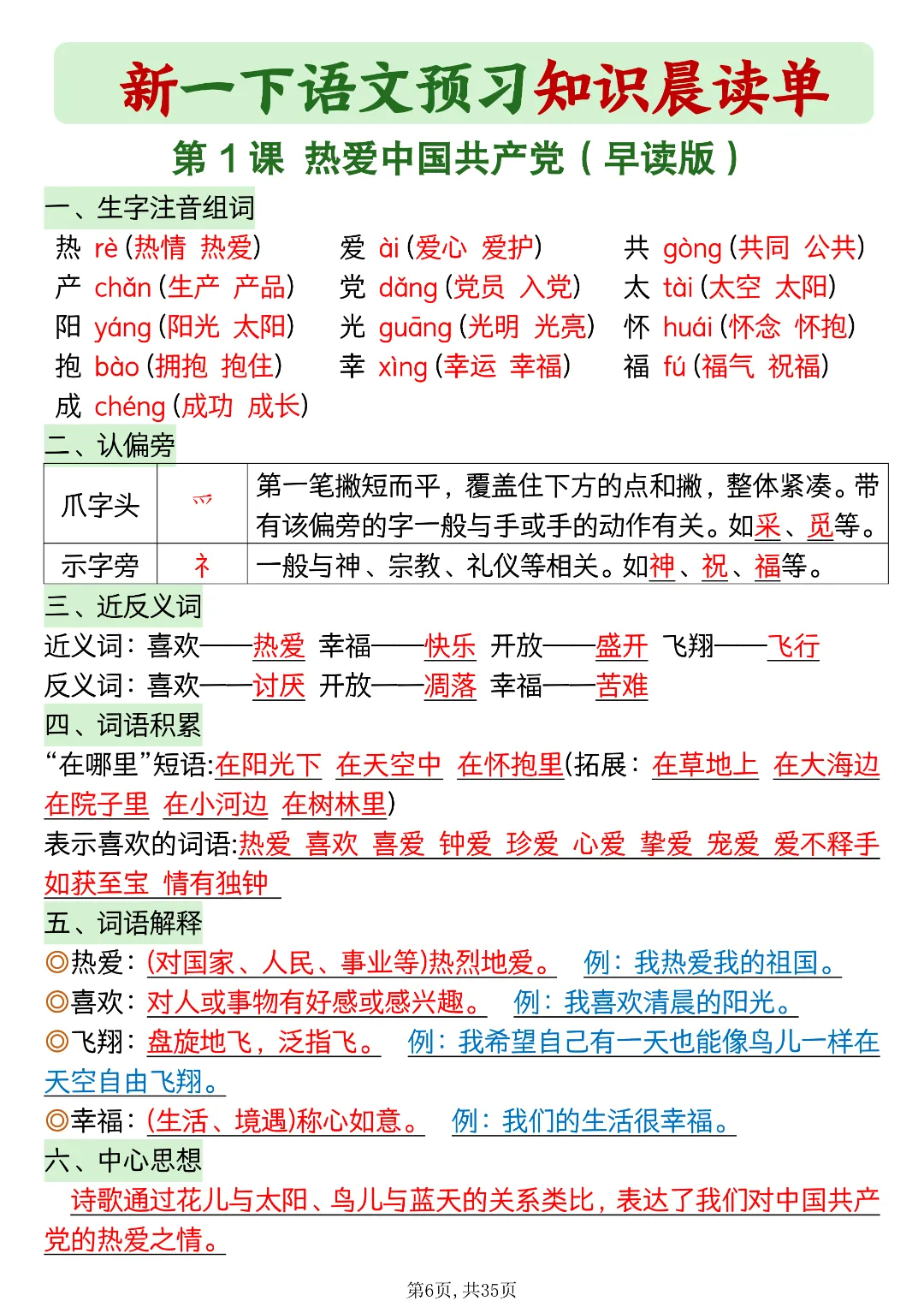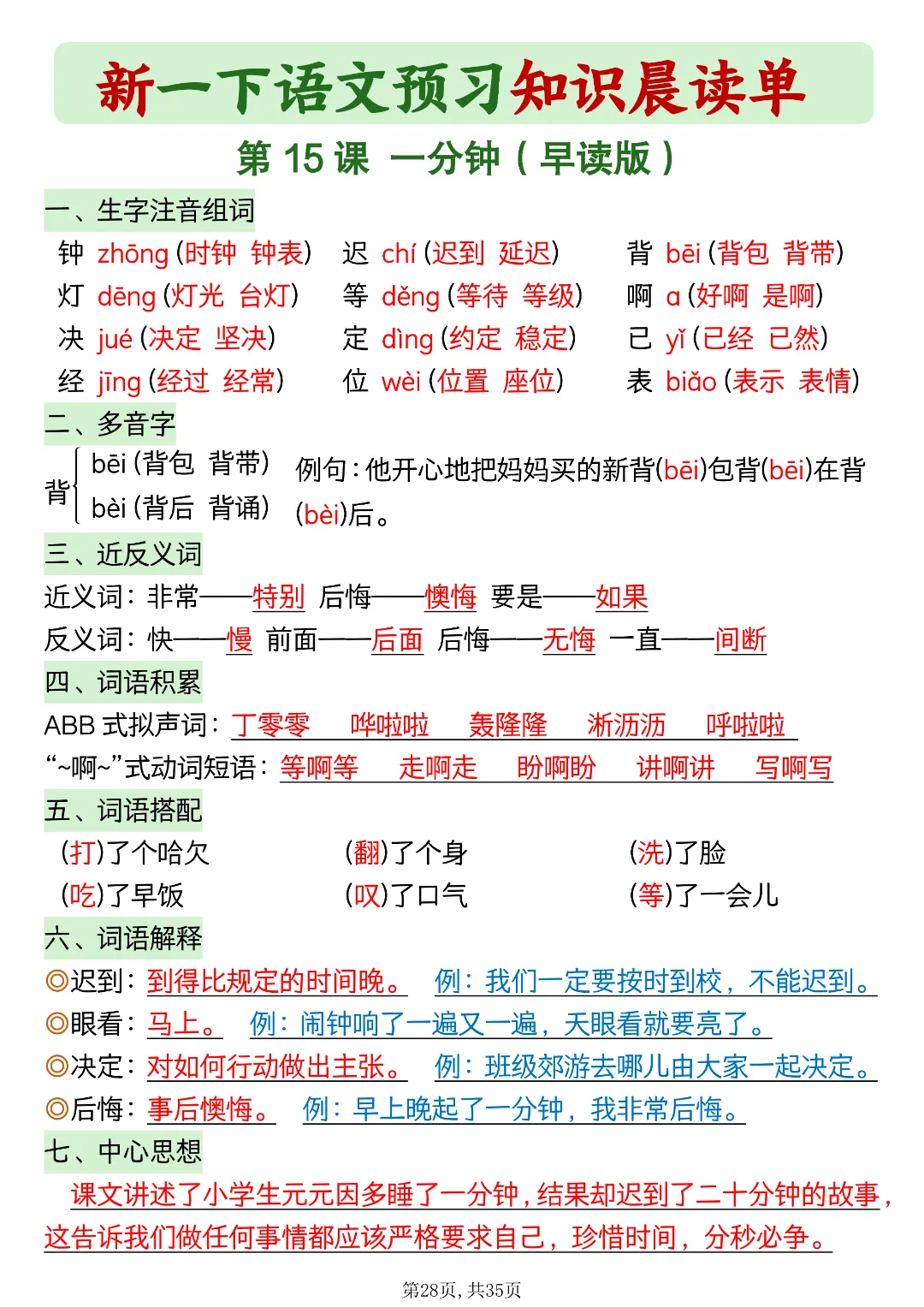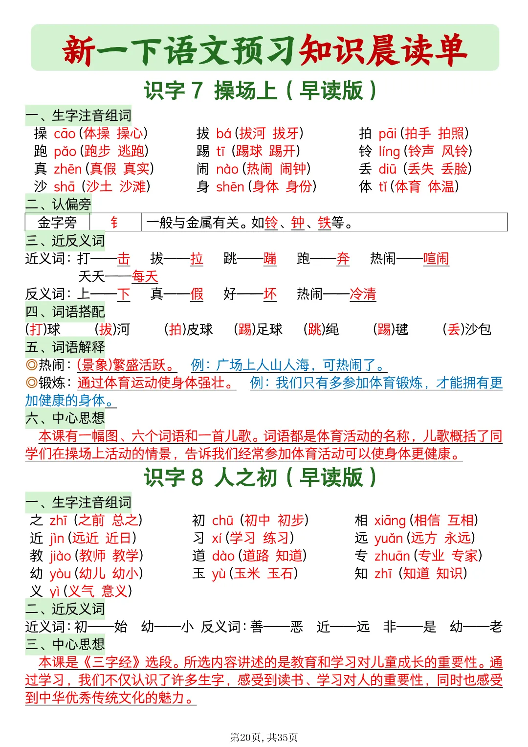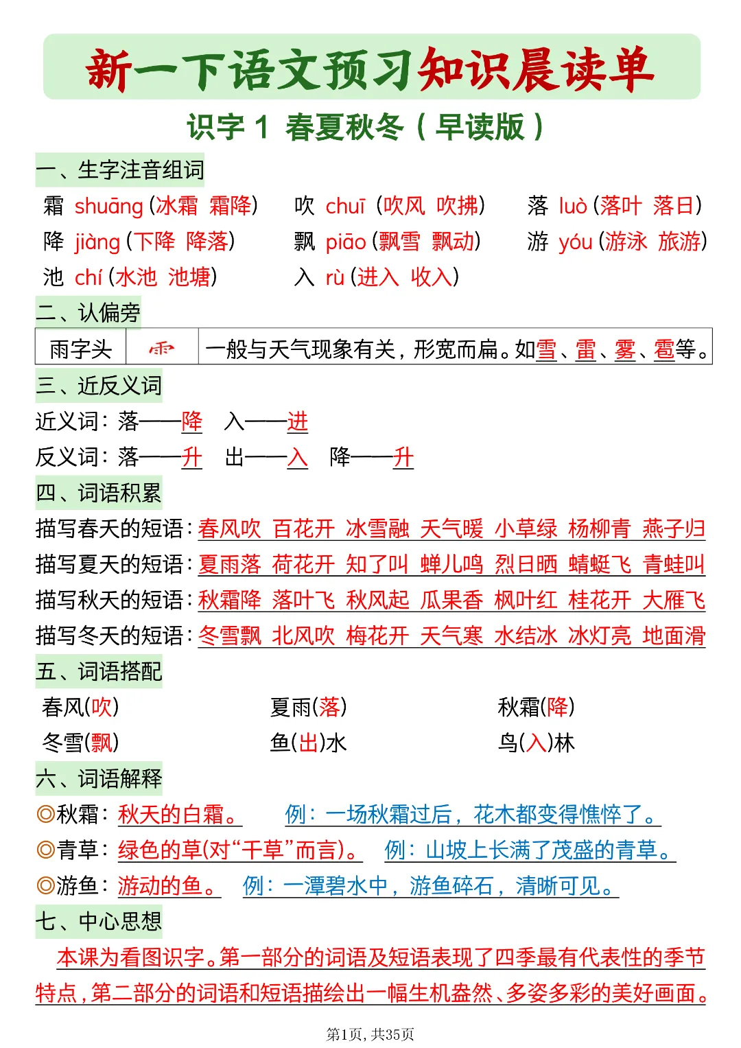 26年春人教新版一年级下册语文每课知识晨读单,共35页,电子版可下载可打印,这份一下语文每课晨读单,包含了每篇课文的生字注音组词、认偏旁、近反义词、词语积累、词语解释、课文中心思想等内容,帮助孩子系统性地梳理每课重点知识,提升一年级的语文学习水平。需要的家长打印出来,让孩子记一记,背一背吧。