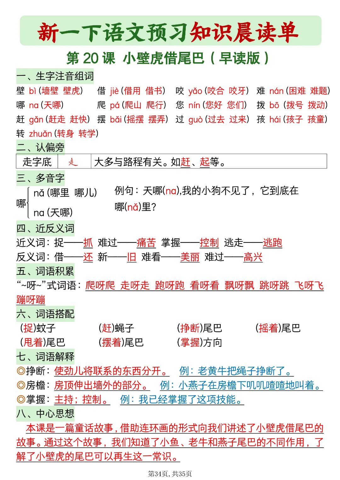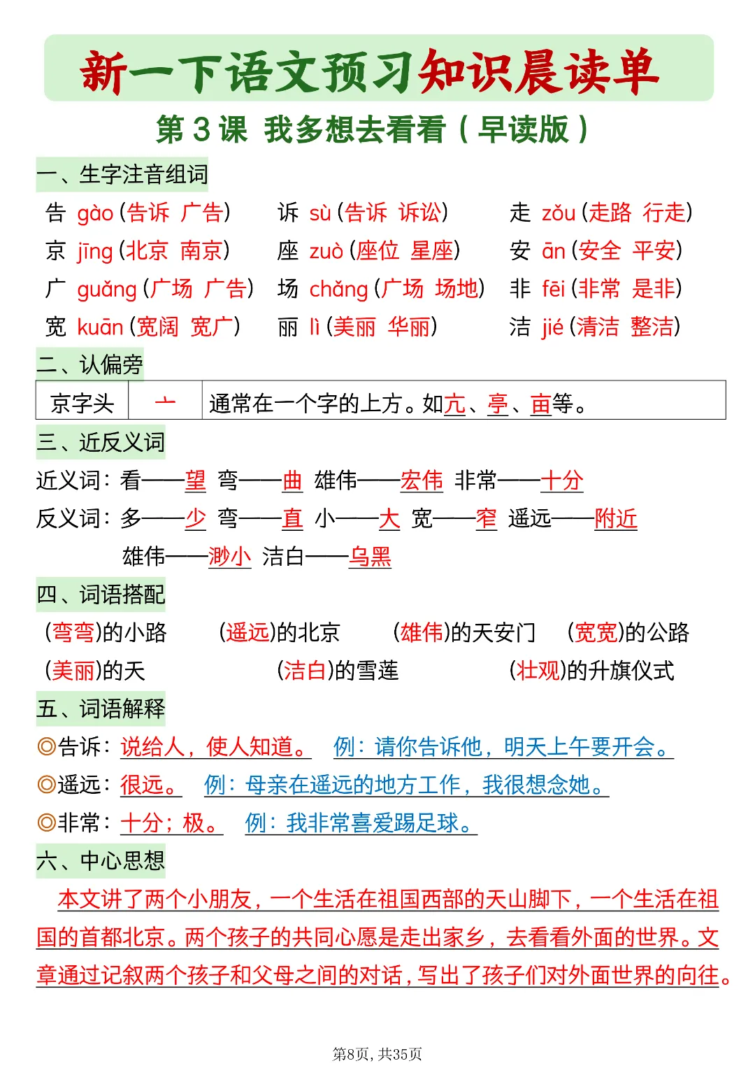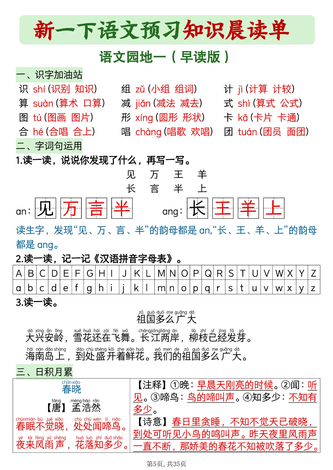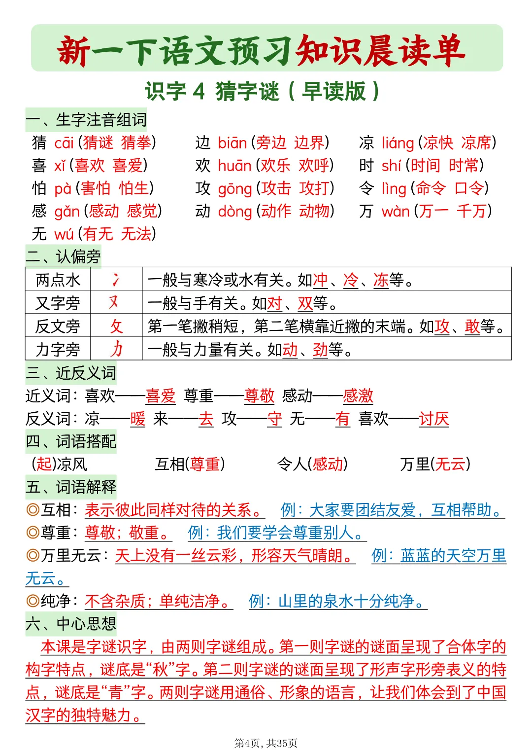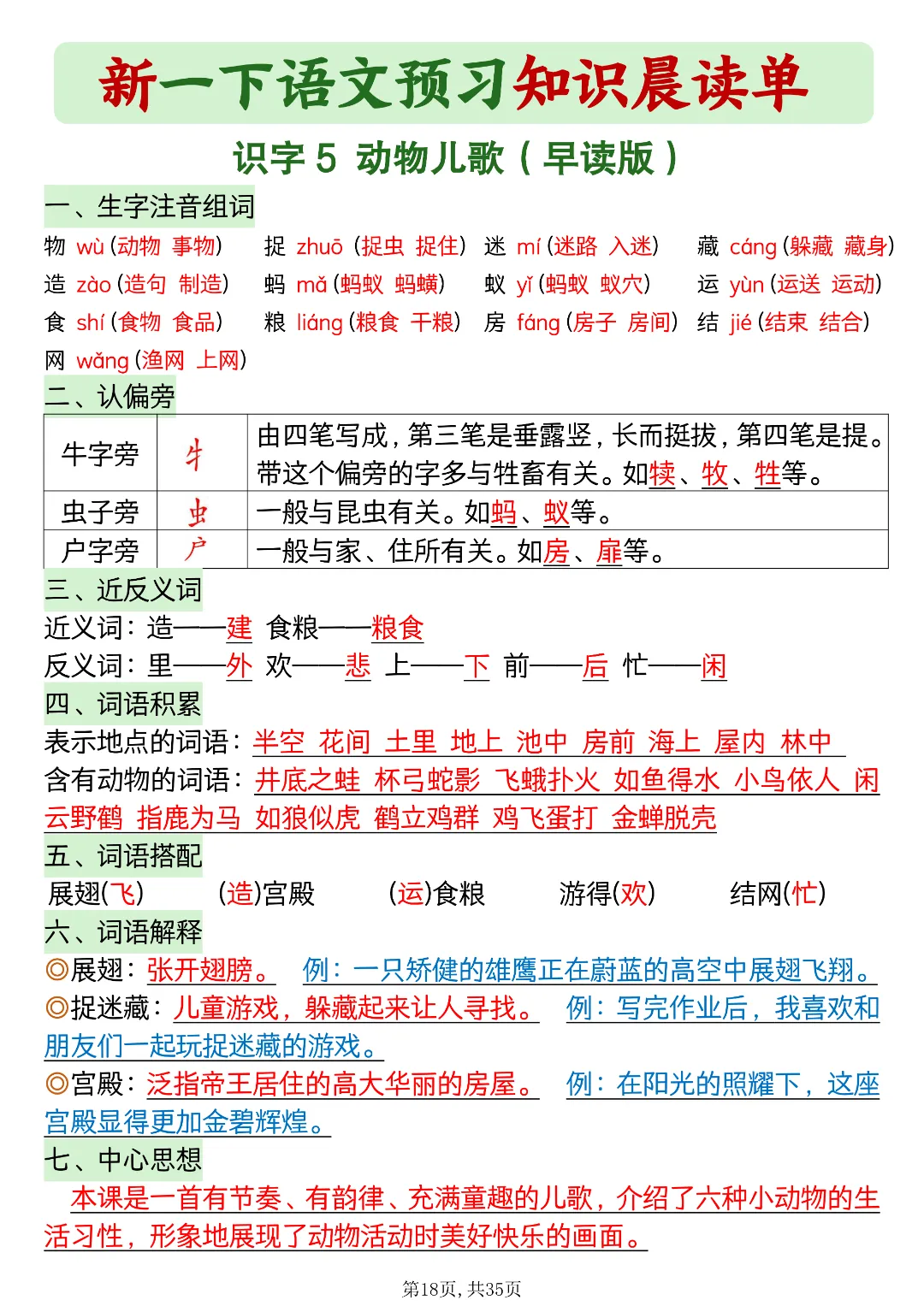 26年春人教新版一年级下册语文每课知识晨读单,共35页,电子版可下载可打印,这份一下语文每课晨读单,包含了每篇课文的生字注音组词、认偏旁、近反义词、词语积累、词语解释、课文中心思想等内容,帮助孩子系统性地梳理每课重点知识,提升一年级的语文学习水平。需要的家长打印出来,让孩子记一记,背一背吧。