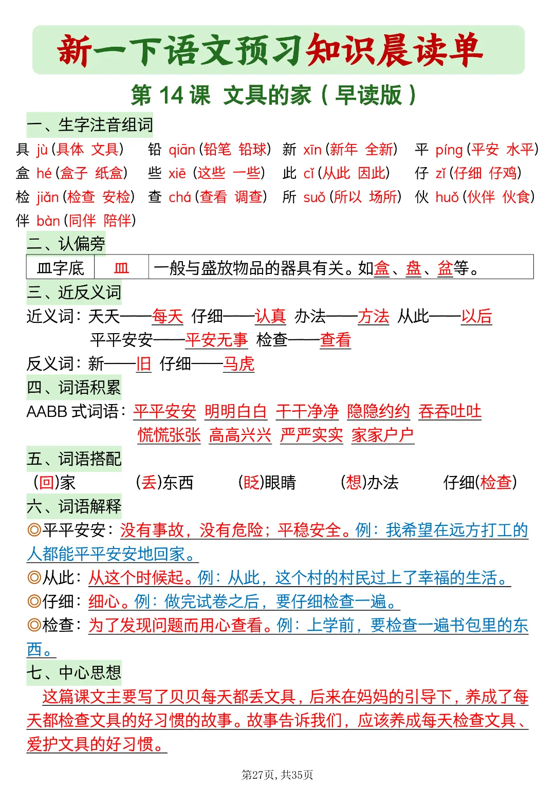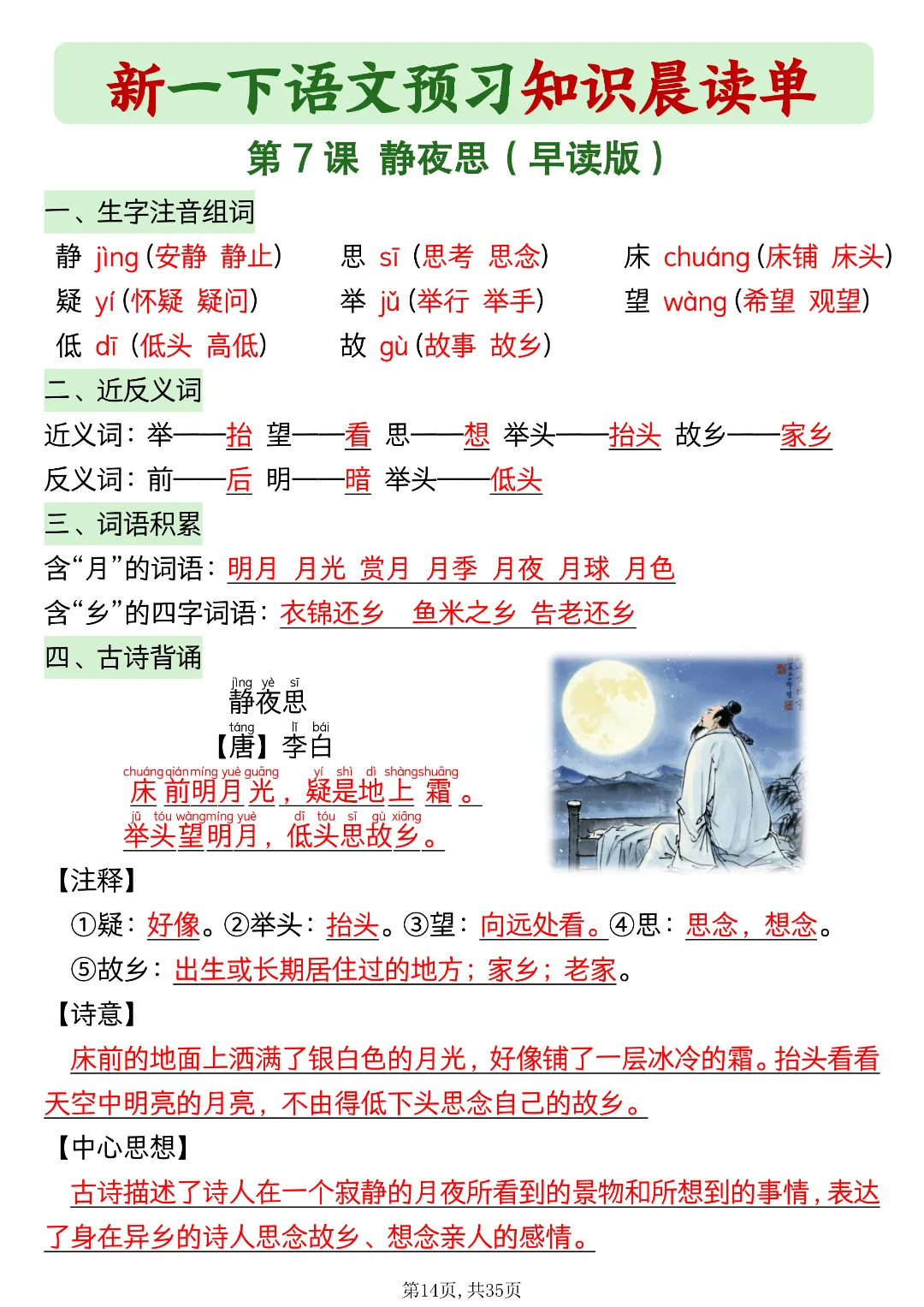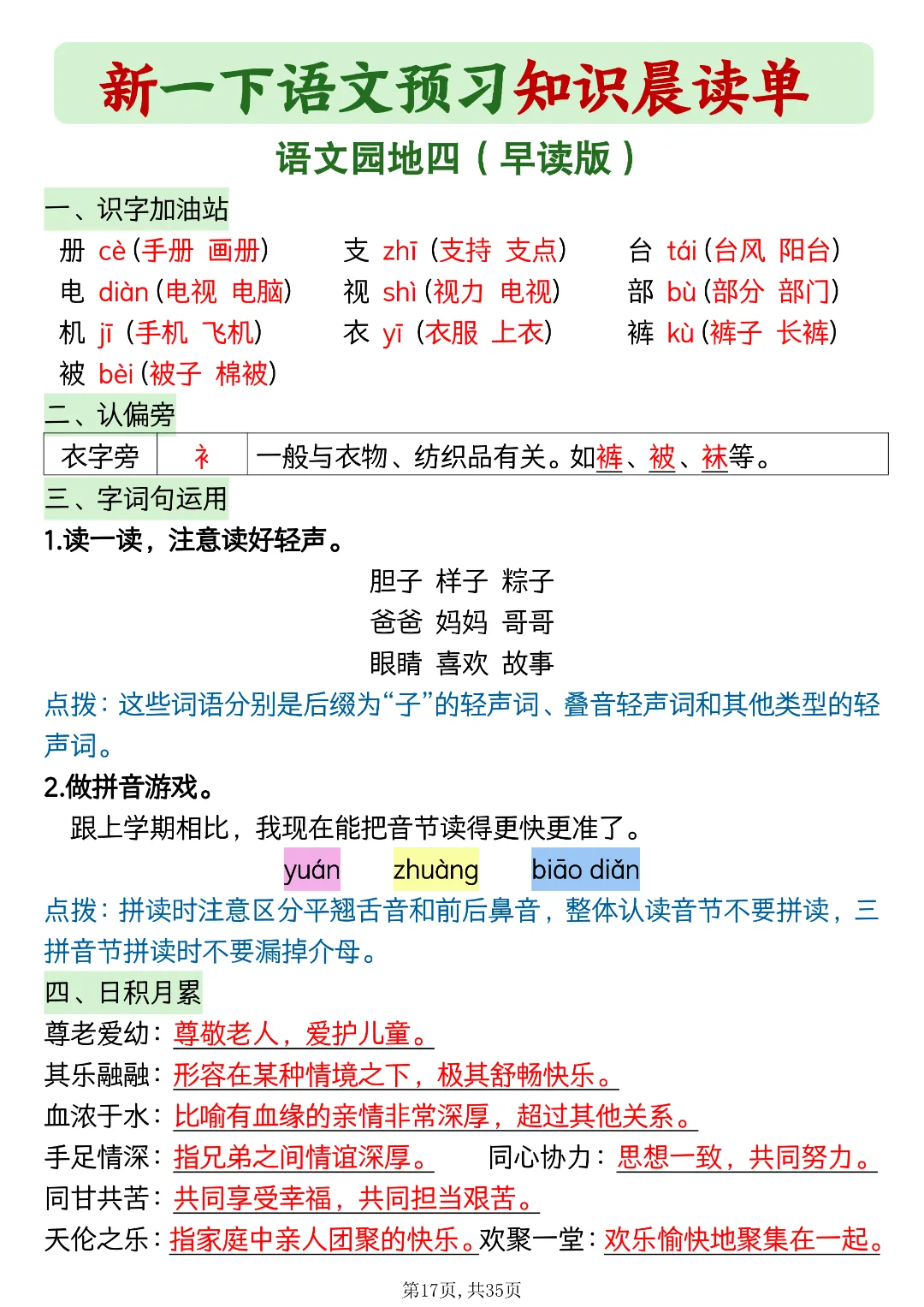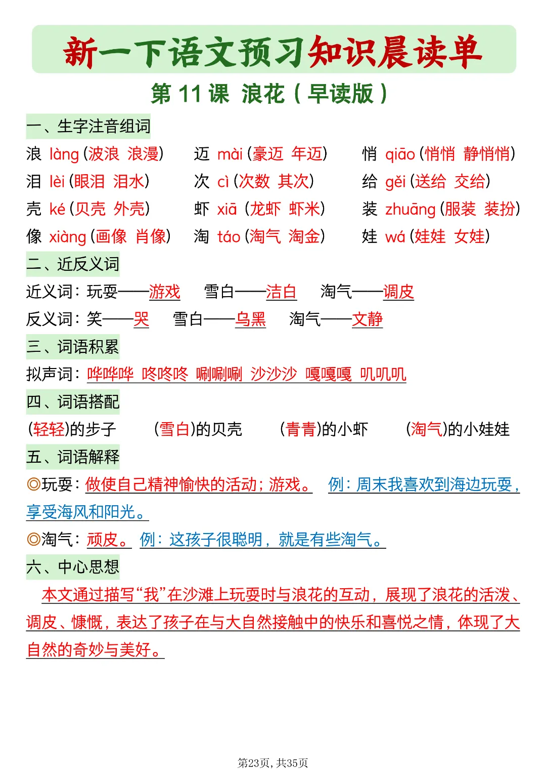 26年春人教新版一年级下册语文每课知识晨读单,共35页,电子版可下载可打印,这份一下语文每课晨读单,包含了每篇课文的生字注音组词、认偏旁、近反义词、词语积累、词语解释、课文中心思想等内容,帮助孩子系统性地梳理每课重点知识,提升一年级的语文学习水平。需要的家长打印出来,让孩子记一记,背一背吧。