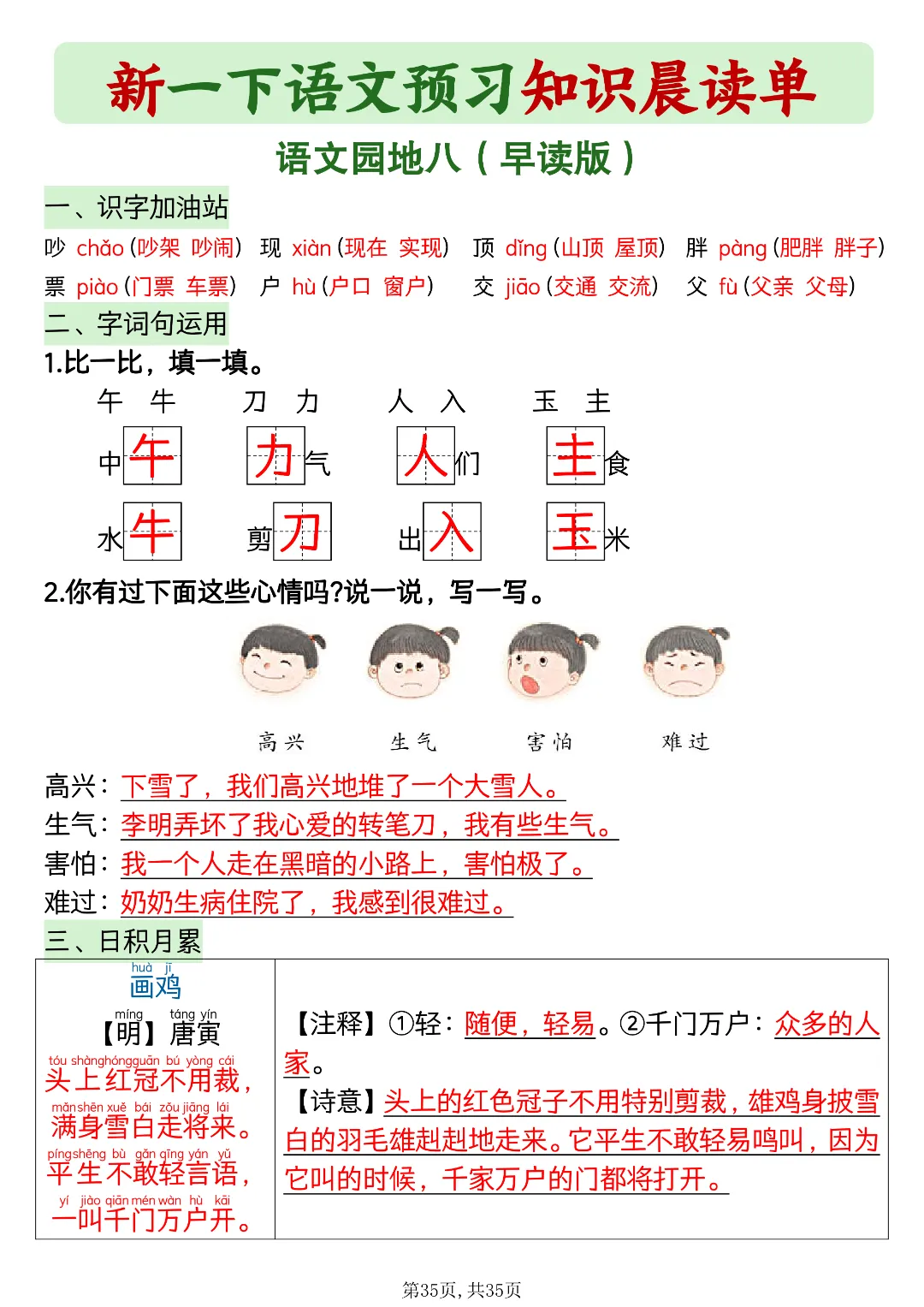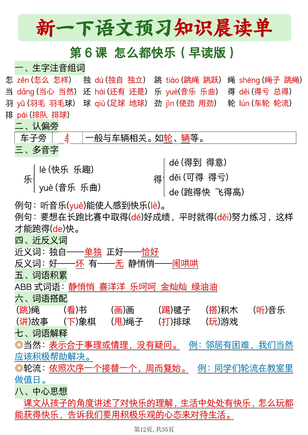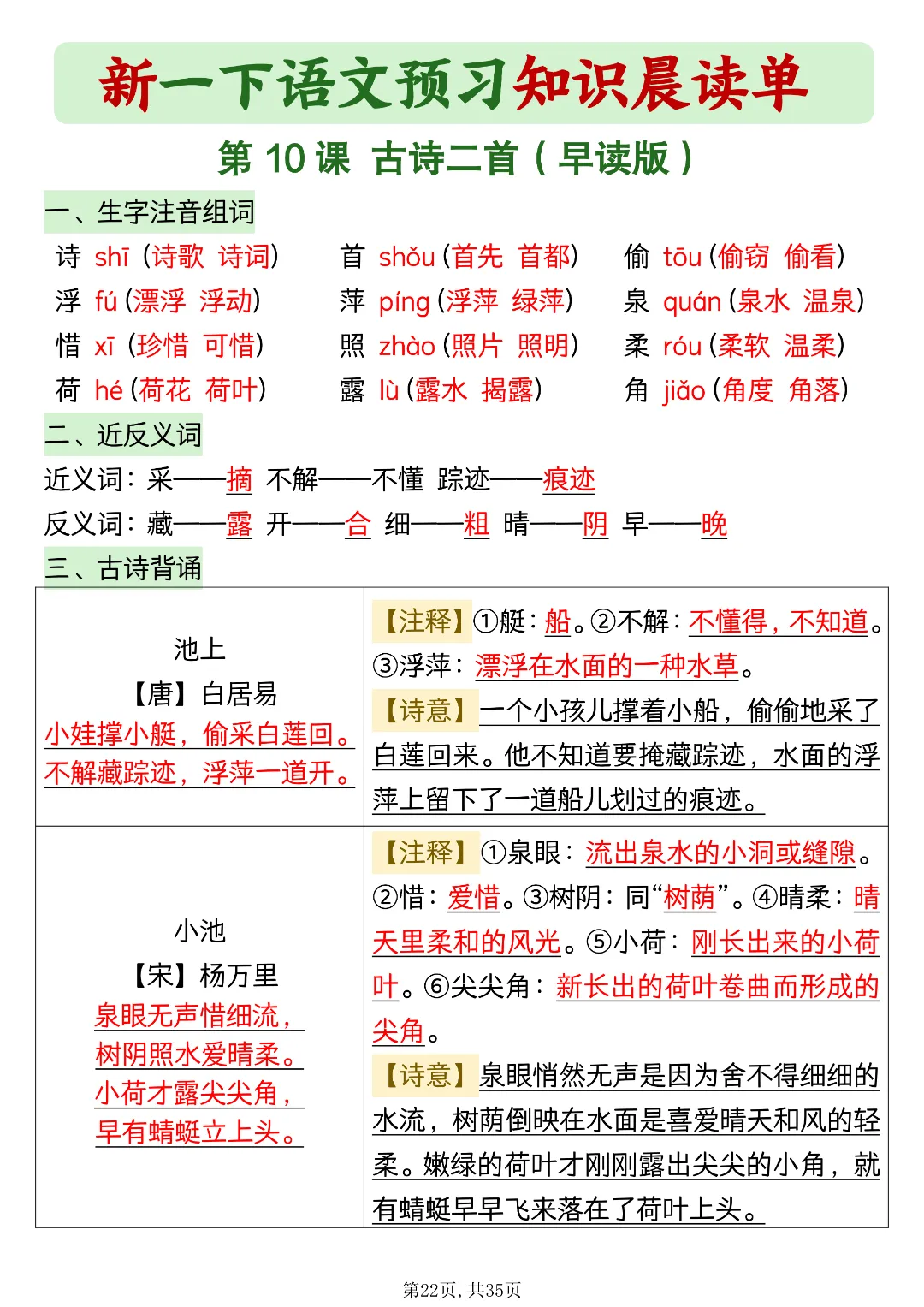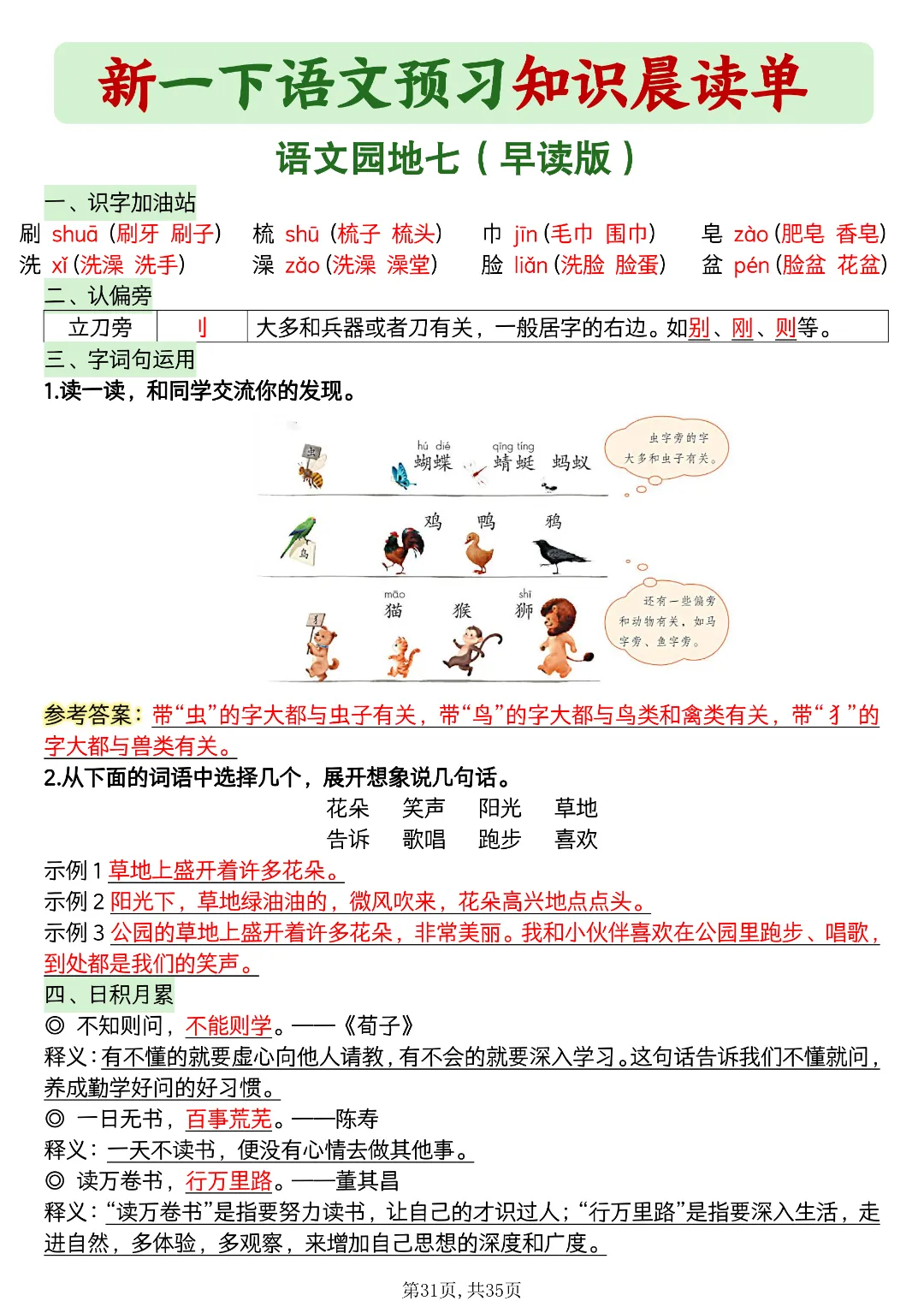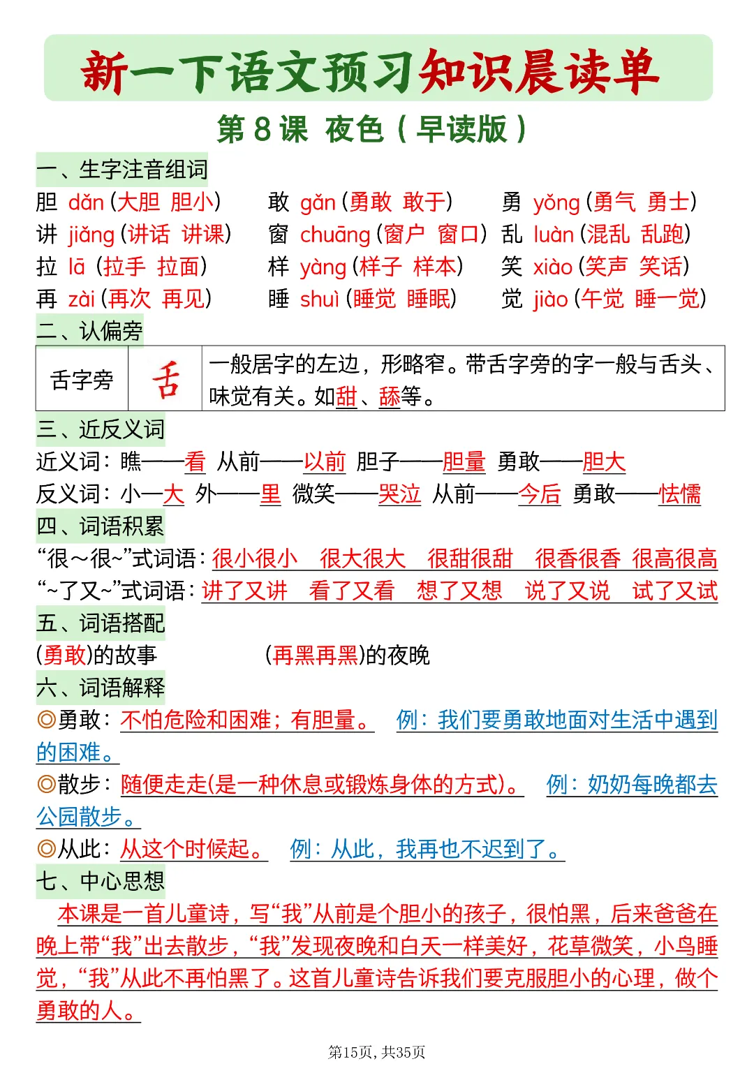 26年春人教新版一年级下册语文每课知识晨读单,共35页,电子版可下载可打印,这份一下语文每课晨读单,包含了每篇课文的生字注音组词、认偏旁、近反义词、词语积累、词语解释、课文中心思想等内容,帮助孩子系统性地梳理每课重点知识,提升一年级的语文学习水平。需要的家长打印出来,让孩子记一记,背一背吧。