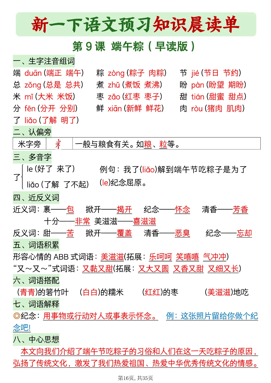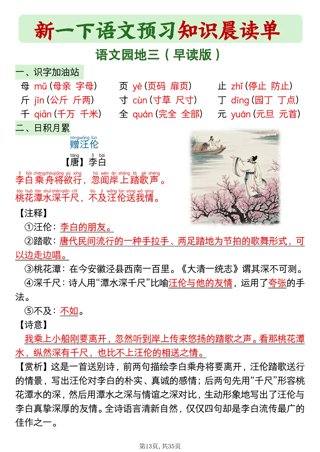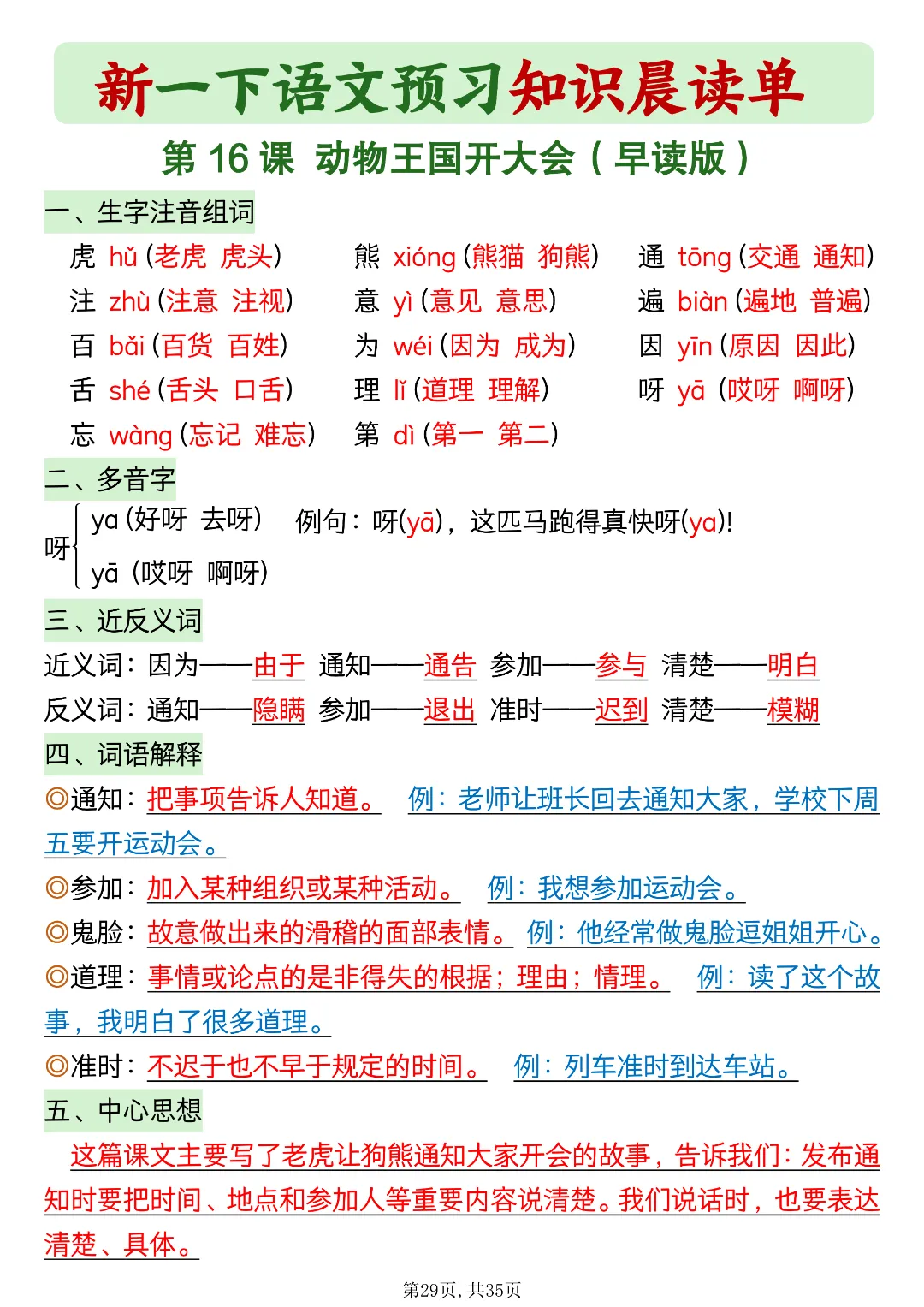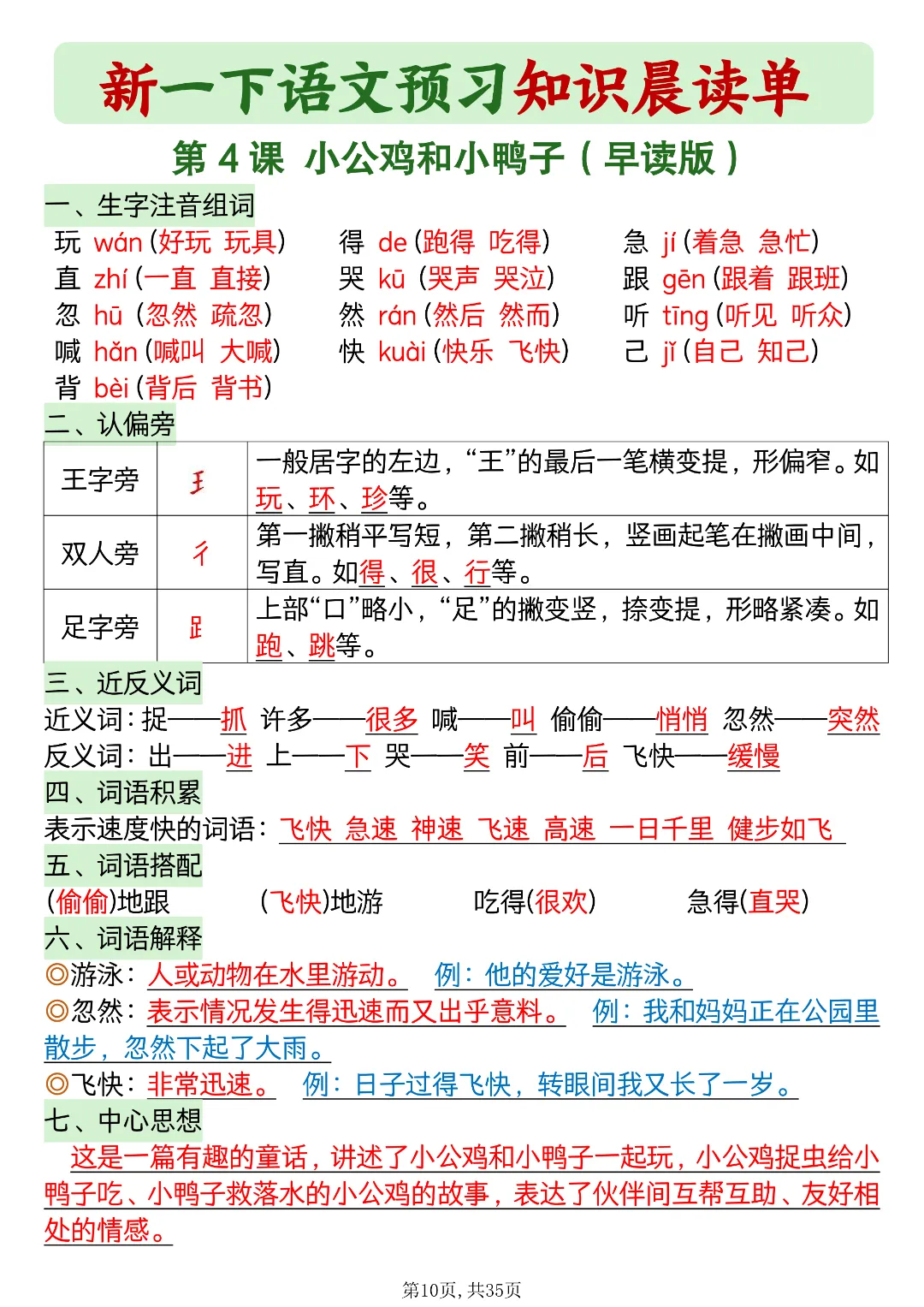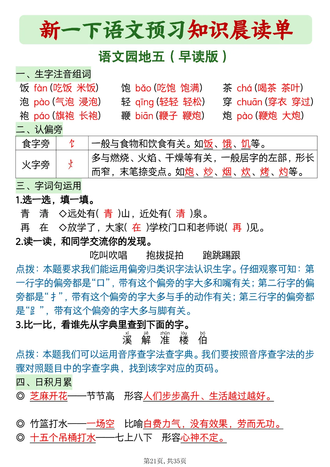 26年春人教新版一年级下册语文每课知识晨读单,共35页,电子版可下载可打印,这份一下语文每课晨读单,包含了每篇课文的生字注音组词、认偏旁、近反义词、词语积累、词语解释、课文中心思想等内容,帮助孩子系统性地梳理每课重点知识,提升一年级的语文学习水平。需要的家长打印出来,让孩子记一记,背一背吧。