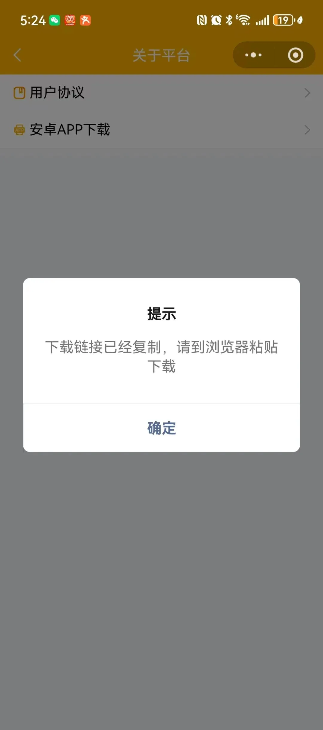 复制下载链接:在“关于平台”页面,点击“安卓APP下载”。系统会自动复制下载链接,并弹出提示“下载链接已经复制…”。