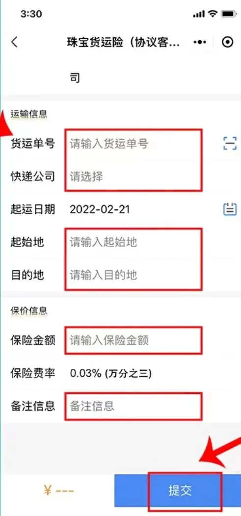 第3步:填写完整信息,再次确认与实际包裹信息一致,点击“提交”即可完成投保。