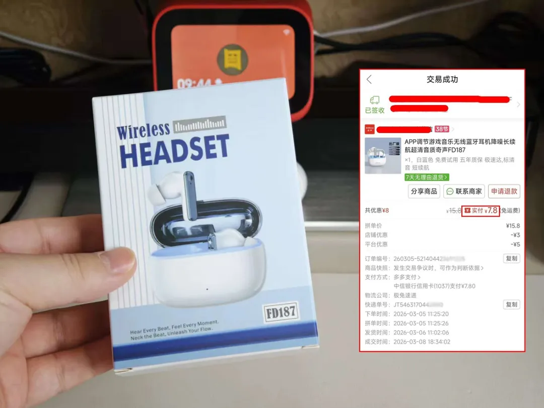 有阵子没写低价耳机了,结果前两天在PDD随手一翻,差点以为自己眼花了——奇声FD187,全新带APP、能定位、触控可自定义,实付4块8包邮到家。你没看错,不是二手,不是拆机,是正儿八经的全新货,连蜜雪冰城都比它贵两倍。
