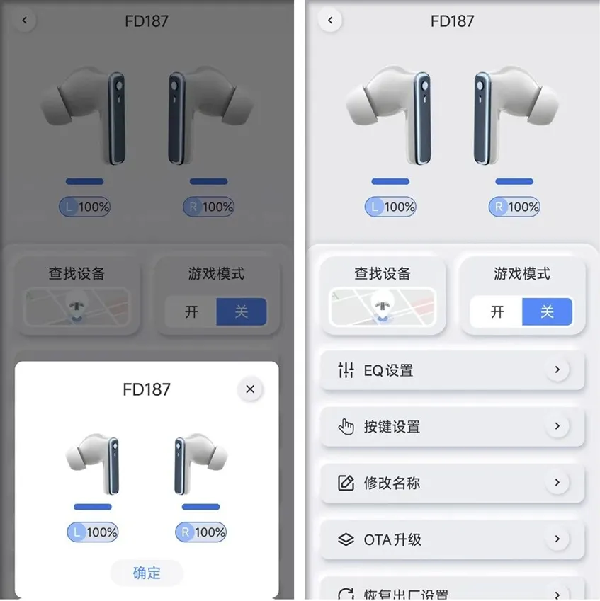 真正让我坐直身子的,是它居然能装官方“原声”APP。连上手机后,弹窗、双耳电量、固件版本全显示,界面简洁得不像几块钱的东西。更离谱的是——支持设备查找功能!点开“播放声音”,耳机会发出持续“滴——”的蜂鸣,沙发缝、床底、外套口袋,一秒定位;