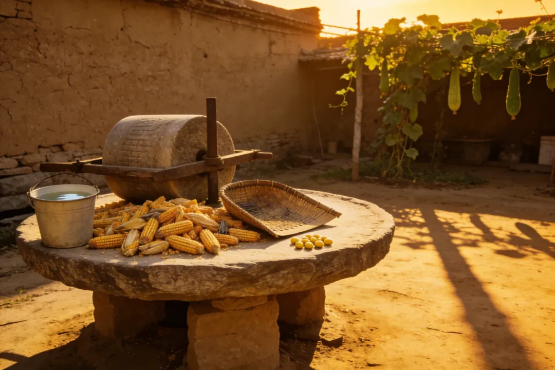 那盘石磨在院子角落里,上面堆满了杂物。以前过年,家家都要推磨做豆腐。