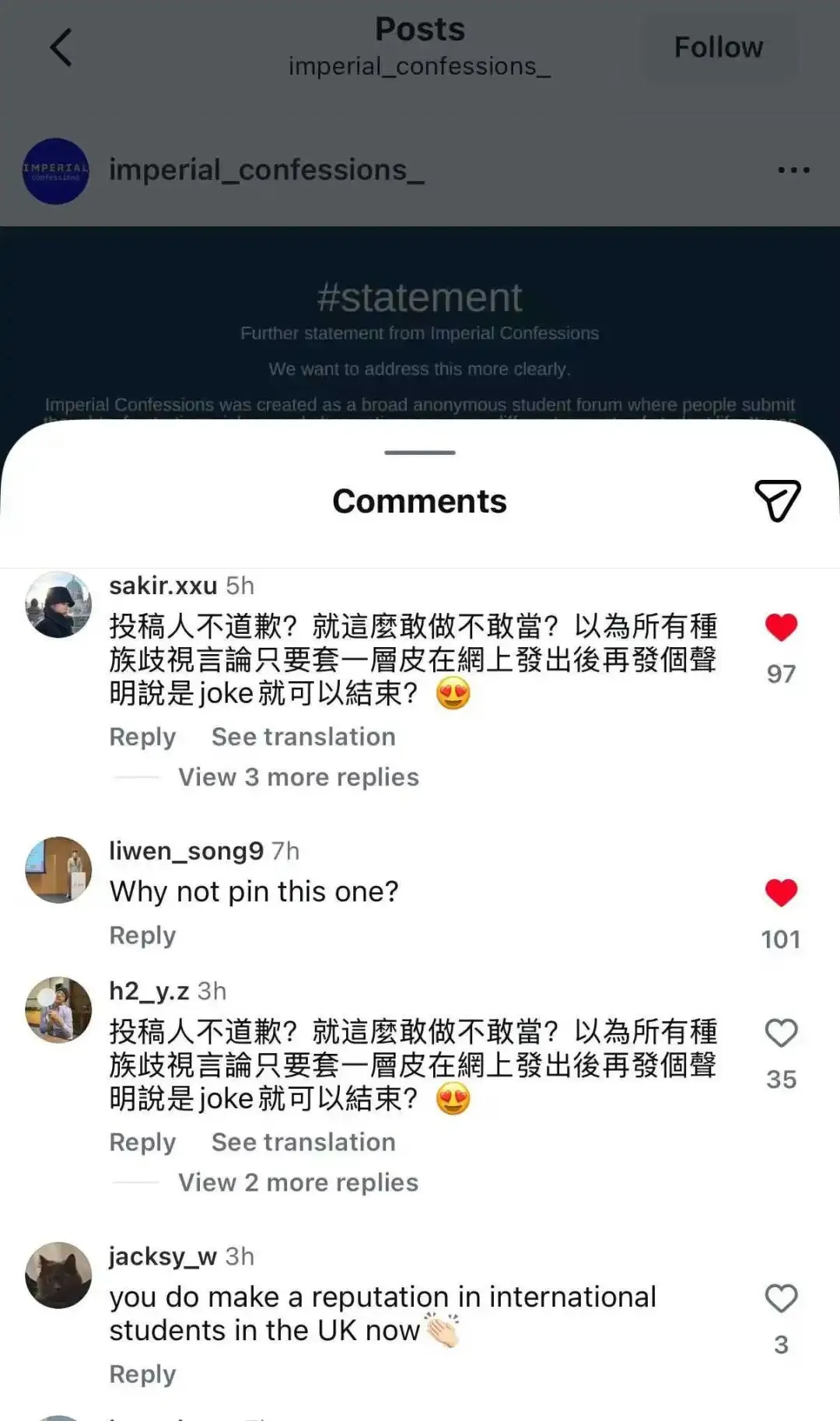 于是前几天晚上,一些留学生给帝国理工的相关负责人发送邮件投诉这件事情,指出 Imperial Confessions 账号置顶了一条带有明显歧视意味的帖子,并且对中国学生进行了嘲讽。