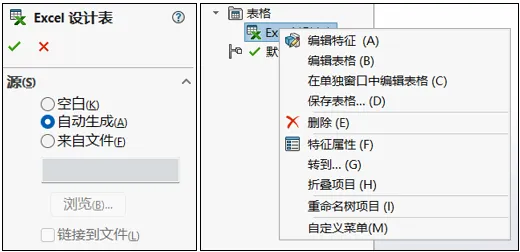 要启用 SOLIDWORKS “设计表” 功能,用户可以在零件/装配体环境下,通过“插入→表格→Excel设计表” 选择 “自动生成”,创建“设计表”以实现SOLIDWORKS设计参数与Excel的联动。SOLIDWORKS将会自动识别零件或装配体中可自动关联的参数,并创建设计表。后续修改设计表内容时,用户可以选择“在单独窗口中编辑表格”通过Excel独立程序编辑内容,也可以选择“编辑表格”命令,在软件中使用Excel表格窗口。如需将设计表保存为外部文件,则可以使用“保存表格”命令。