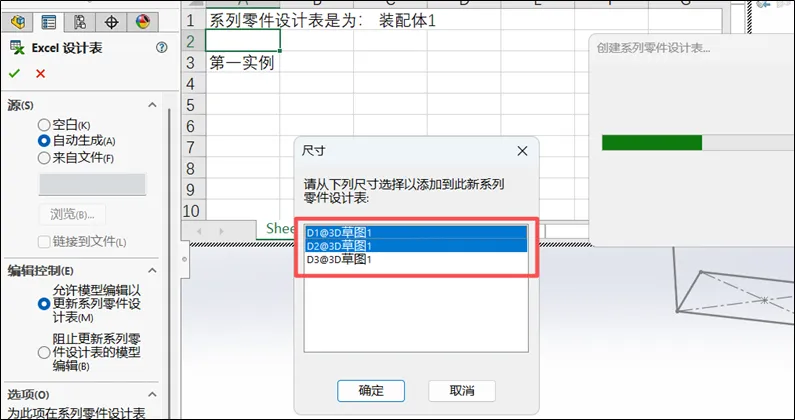 在初次创建装配体的设计表时,若在装配体环境中存在的草图,选择“自动生成”设计表,软件会自动检索出草图中的尺寸。用户可以通过点选是否将草图的尺寸链接到Excel中,如下图所示:
