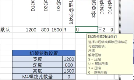 其次,在打开Excel设计表的情况下,通过在视图区域中双击对应的零件,将零件的的状态属性添加至设计表中,零件的状态将会以“S,R,1,0”显示、特征的状态将会以“S,U,1,0”显示,S与1代表“压缩”,R、U与0代表“解压缩”,建议通过“0”与“1”控制零件与特征的压缩状态。