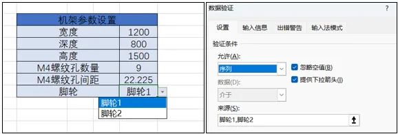 单元格选型可以借助“数据验证”中的“序列”功能,在来源中输入对应零件型号的名称,中间使用英文输入法的 “,”隔开;