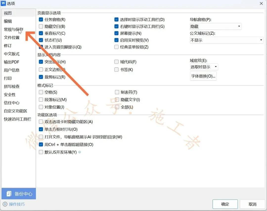打开右上角的文件,然后找到选项,弹出的对话框中找到常规与保存